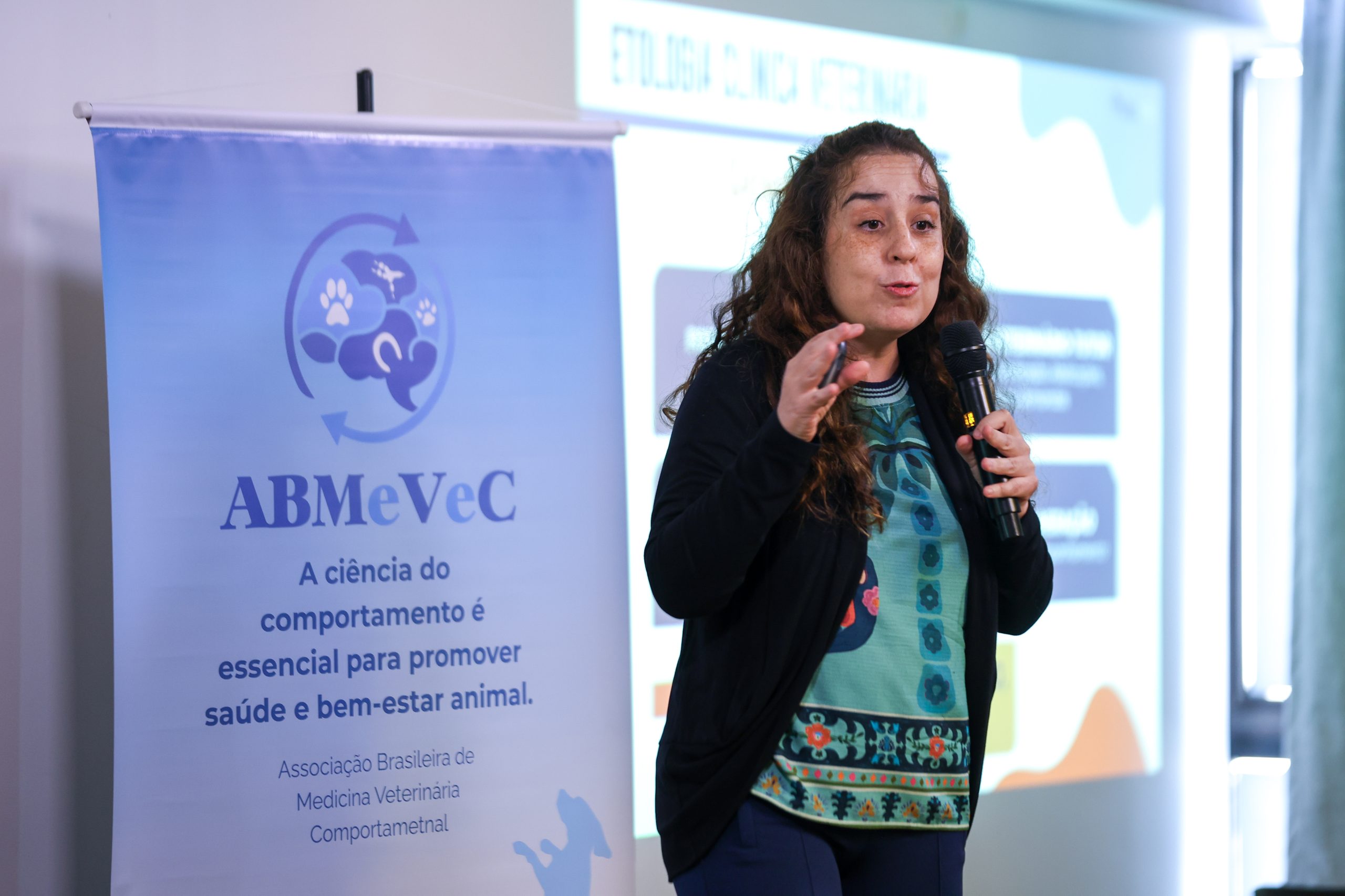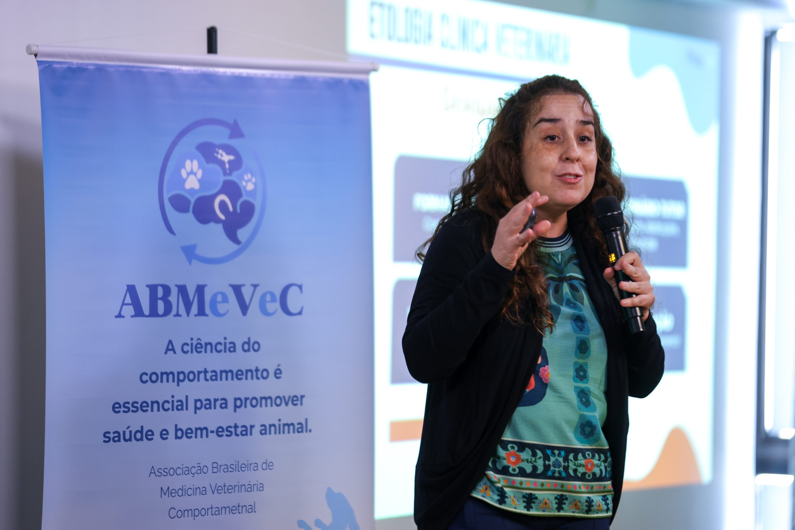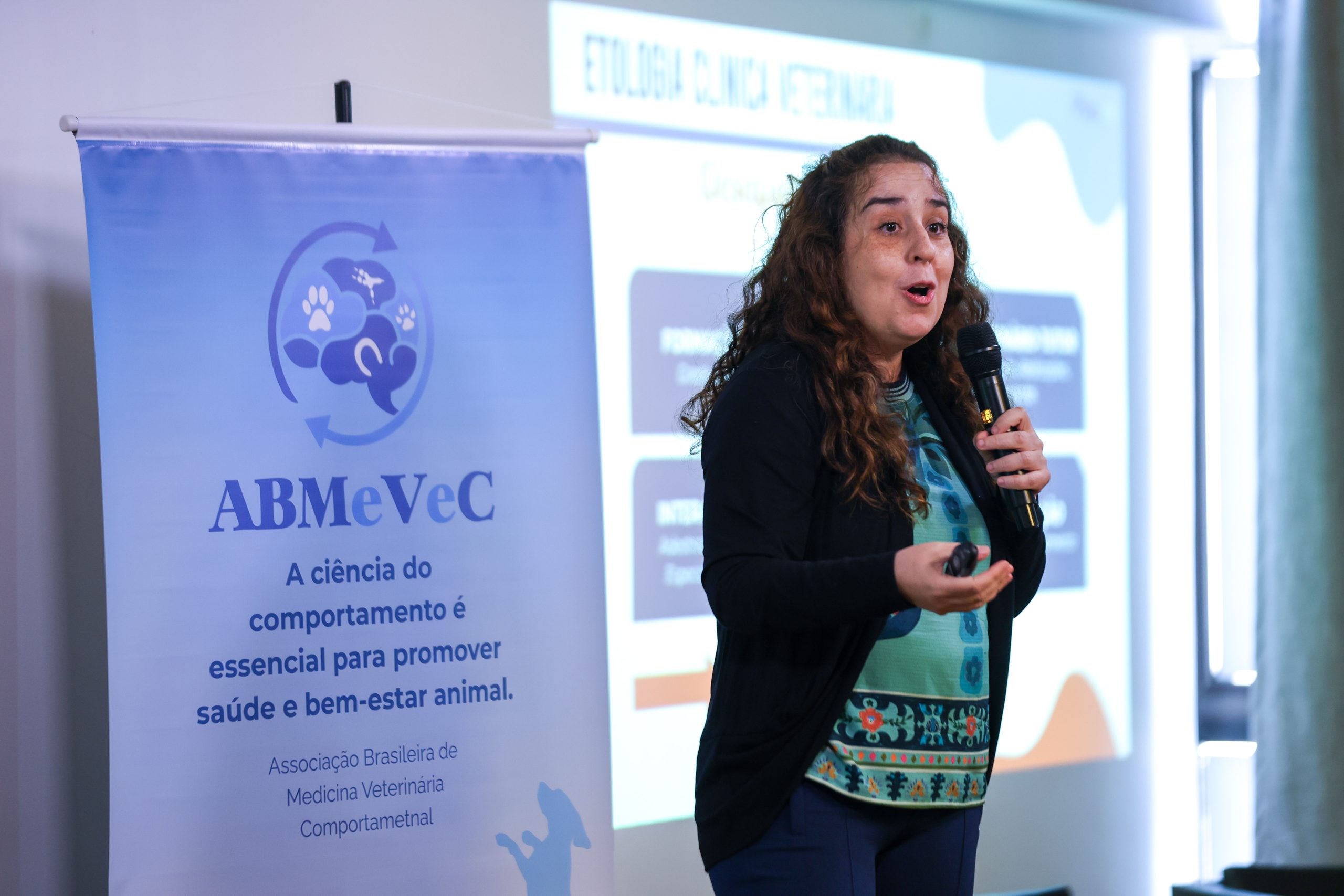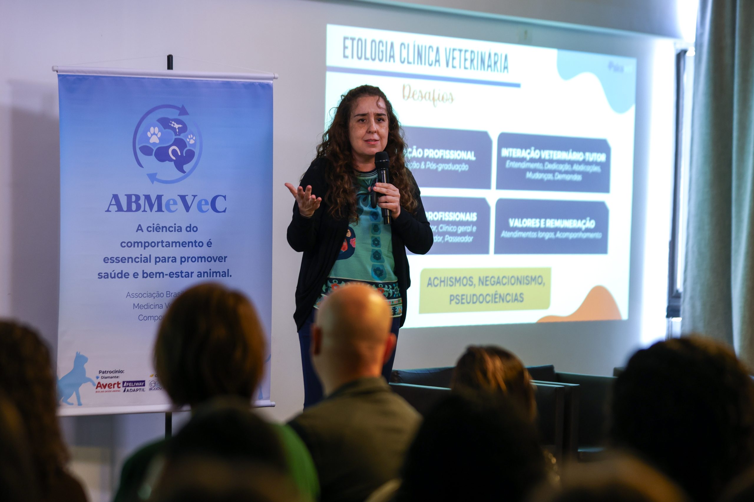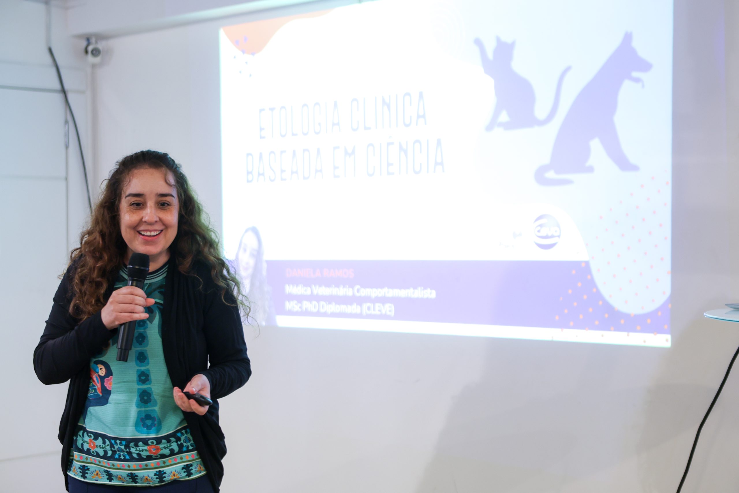 A dra. Daniela Ramos conduziu sessão sobre etologia clínica baseada em ciência, reforçando a necessidade de avaliação crítica das práticas diagnósticas e de intervenção comportamental com suporte em literatura e dados científicos.