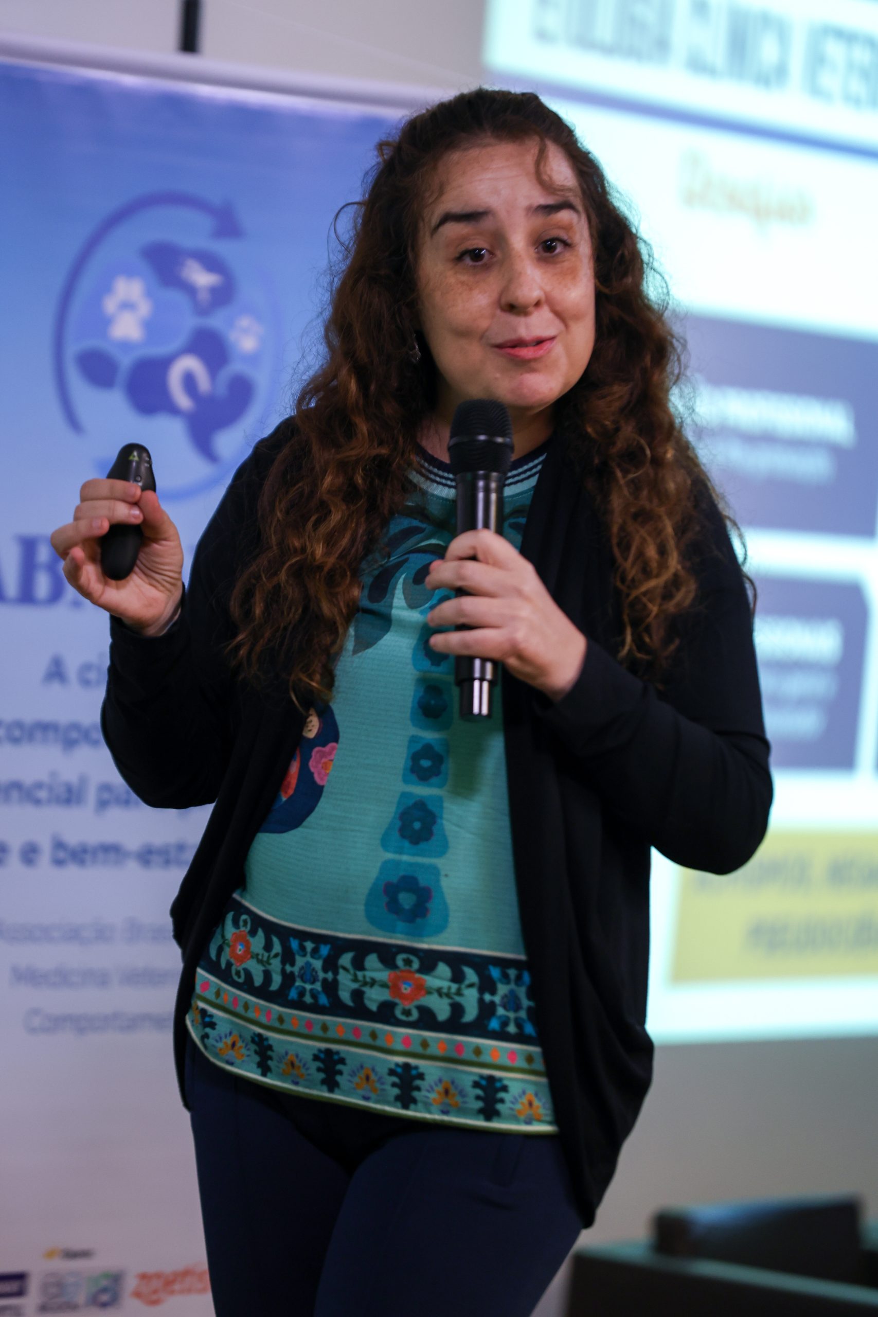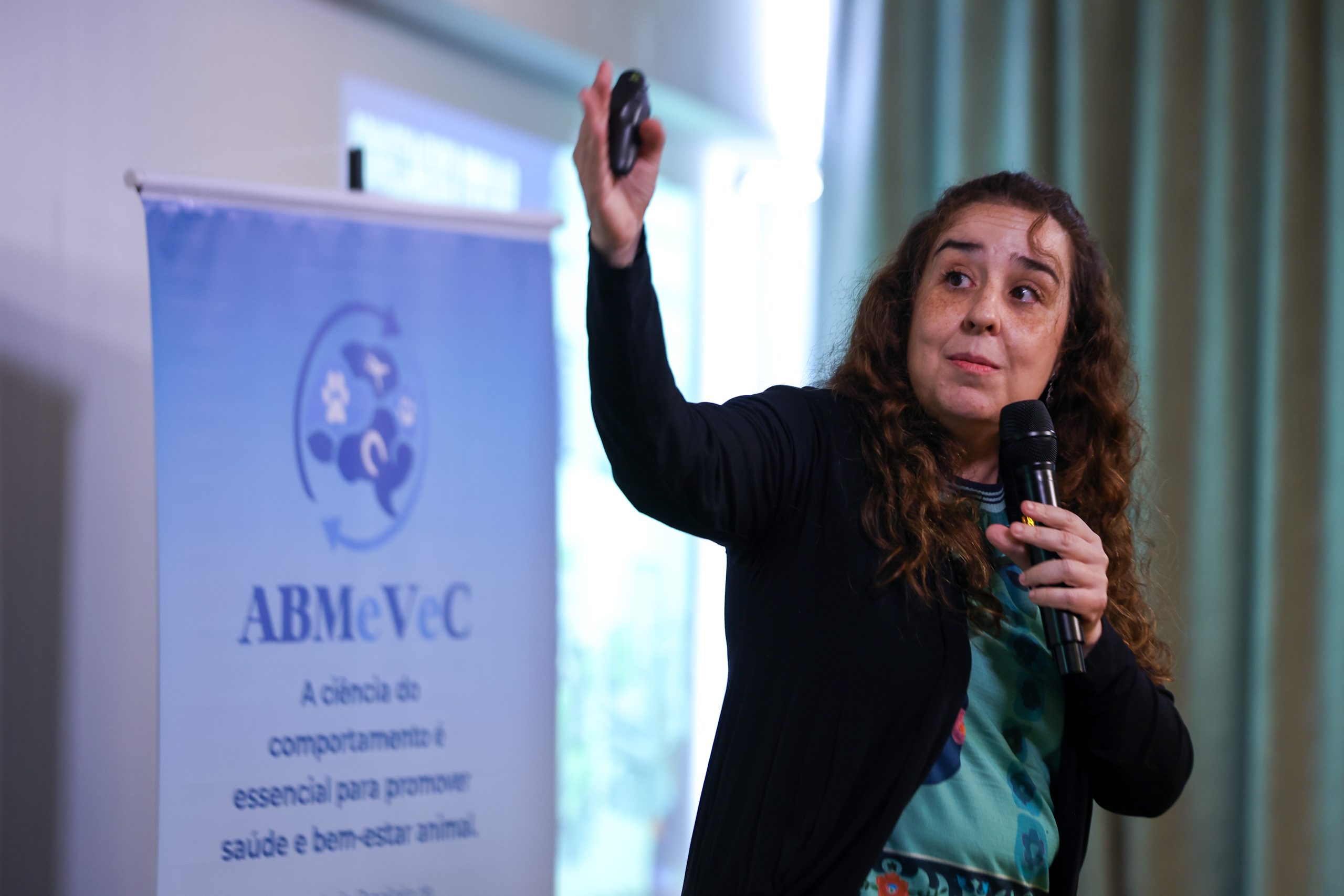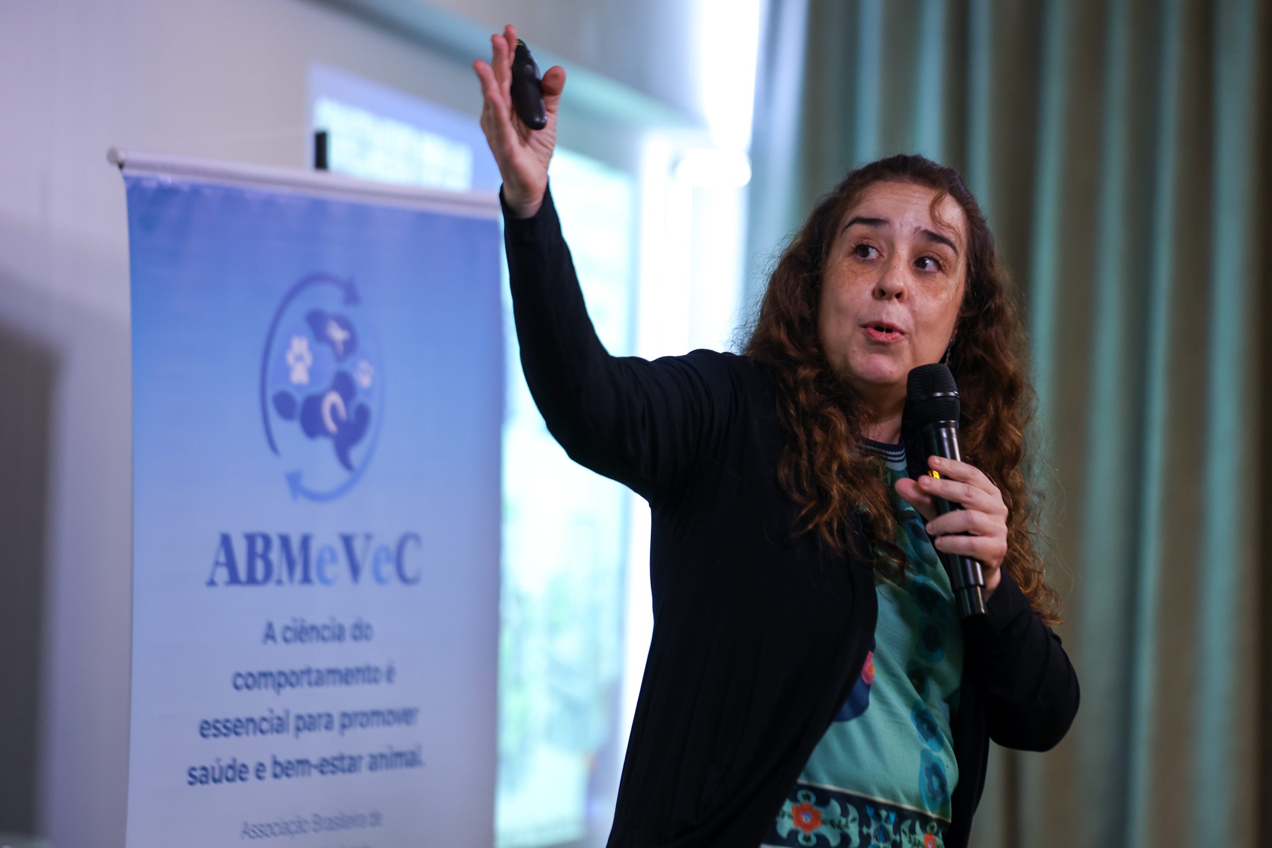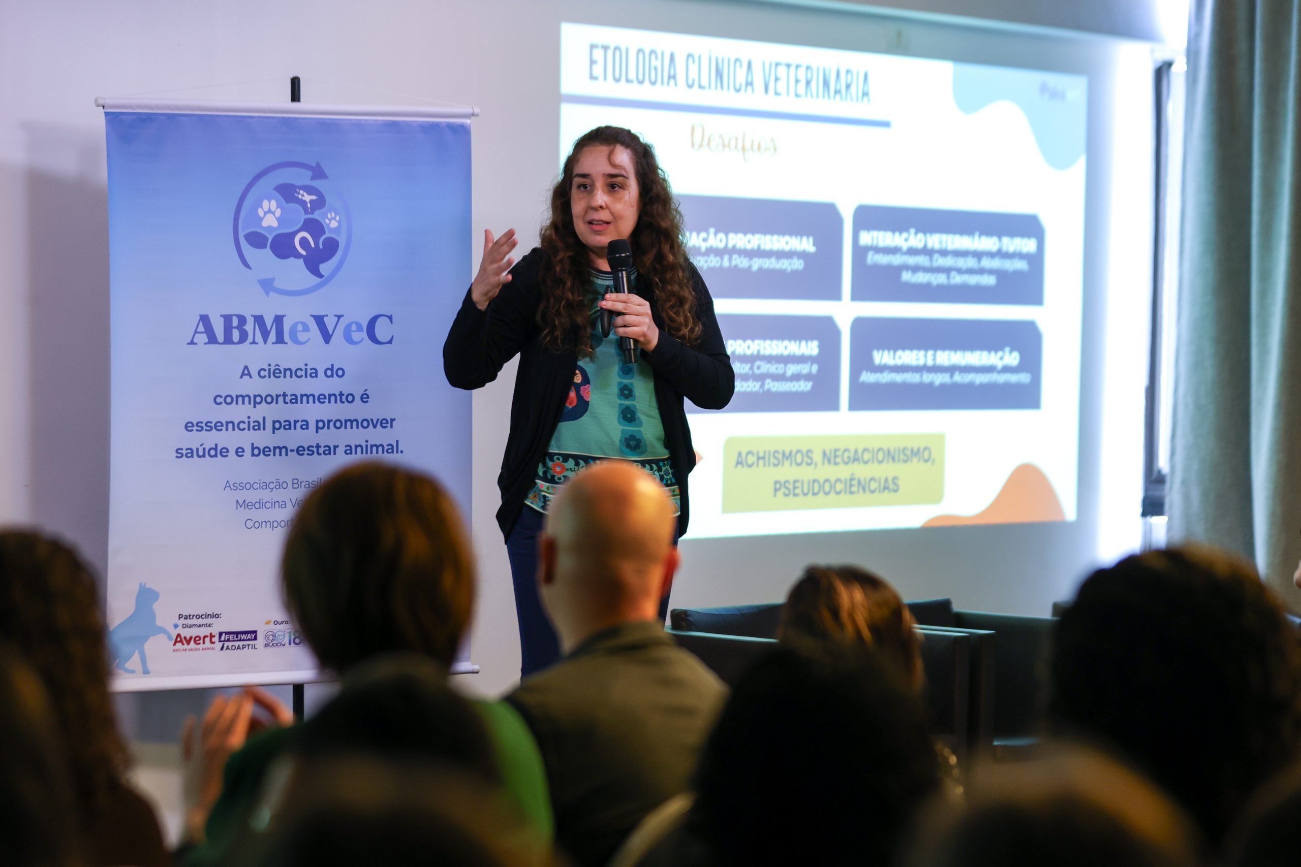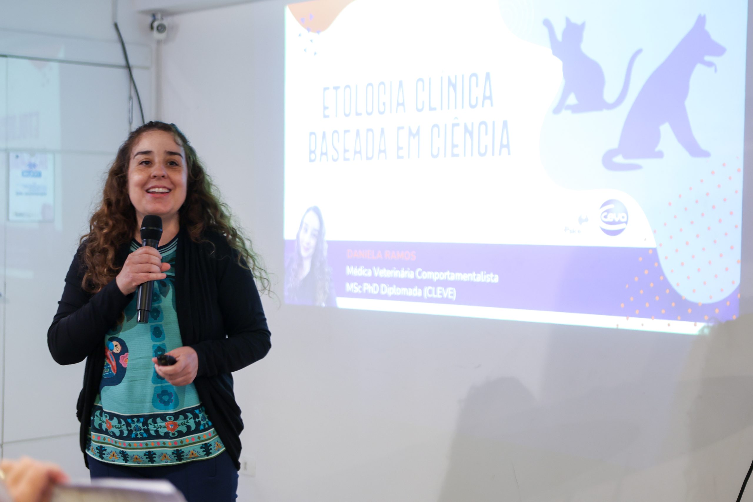 A dra. Daniela Ramos conduziu sessão sobre etologia clínica baseada em ciência, reforçando a necessidade de avaliação crítica das práticas diagnósticas e de intervenção comportamental com suporte em literatura e dados científicos.