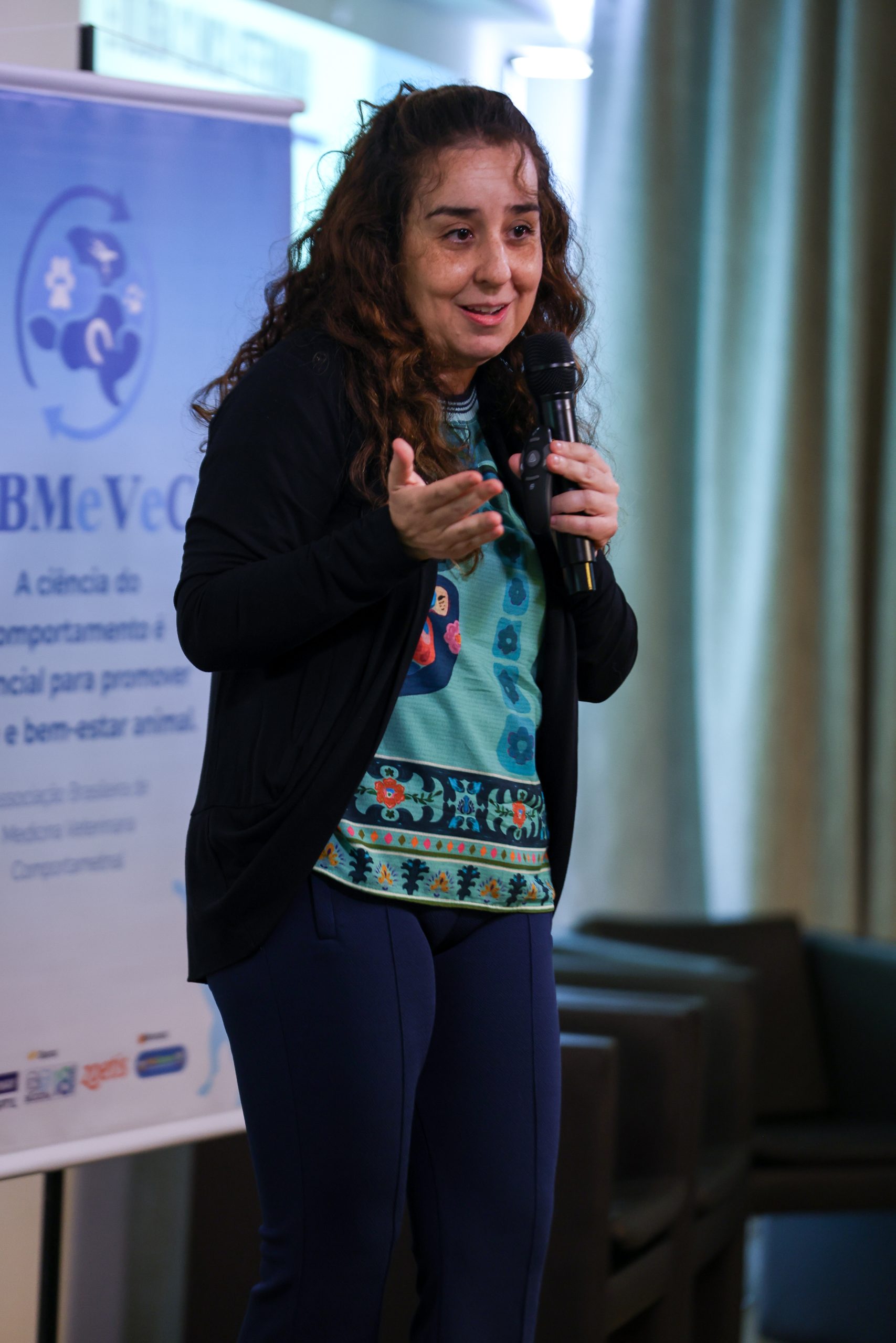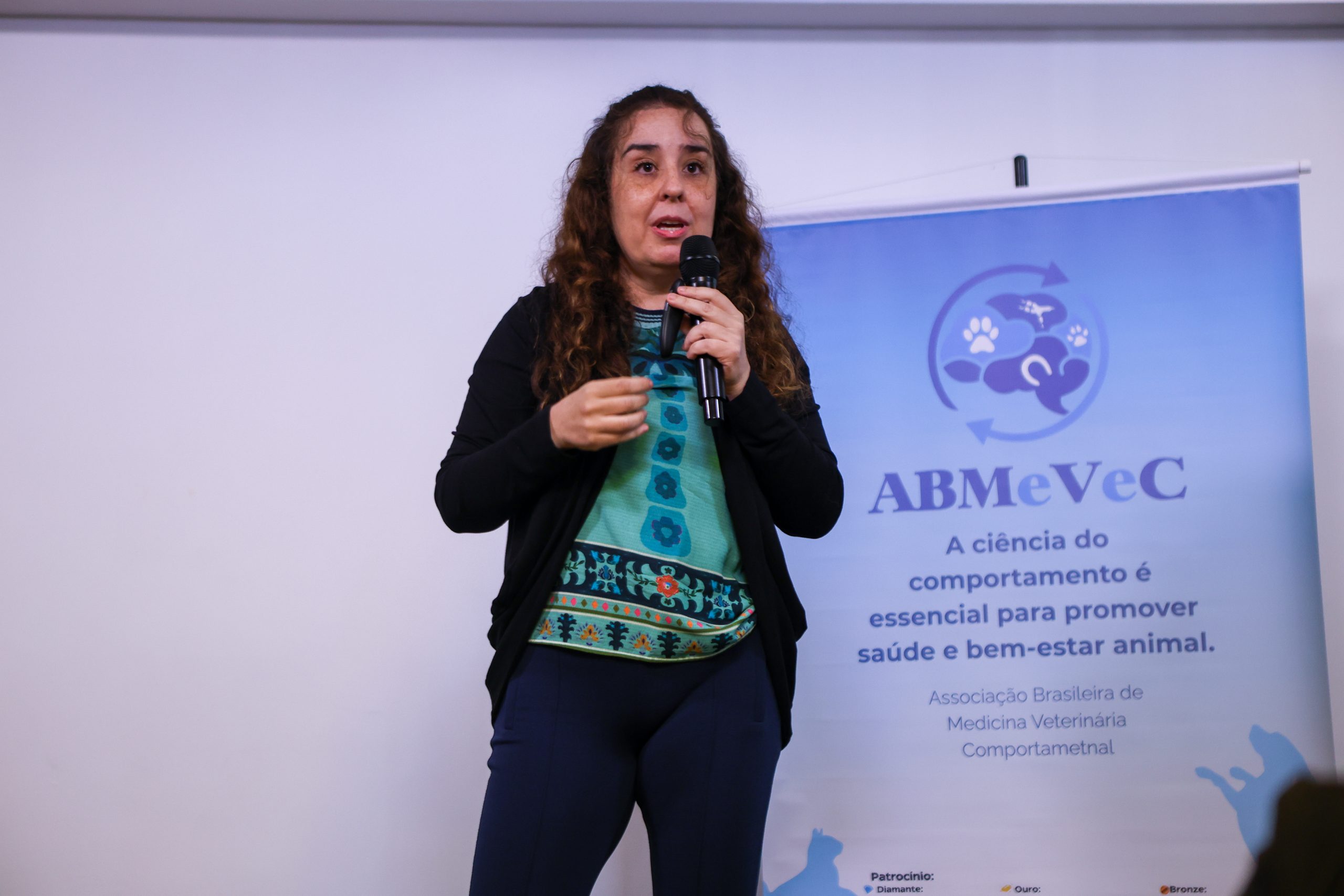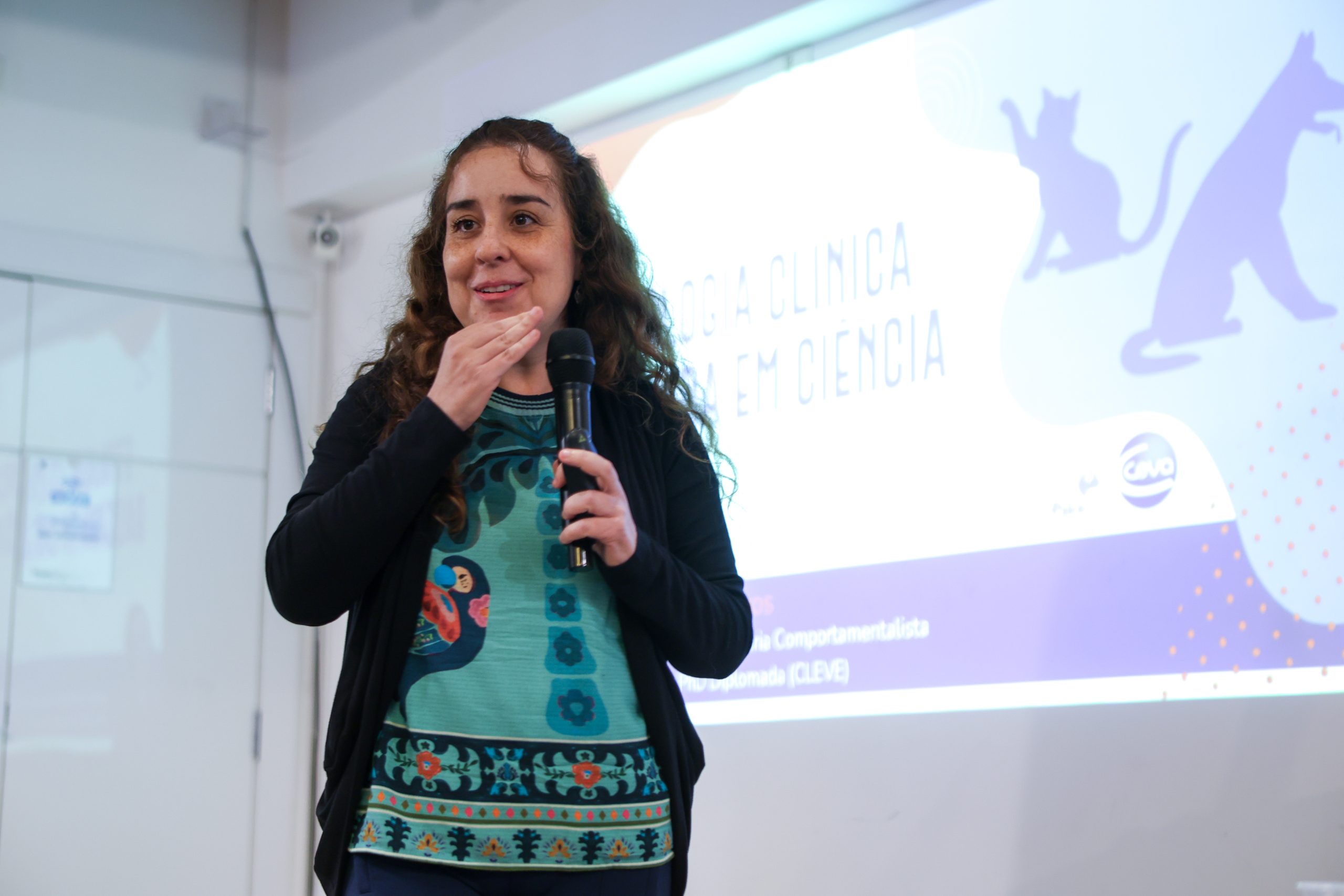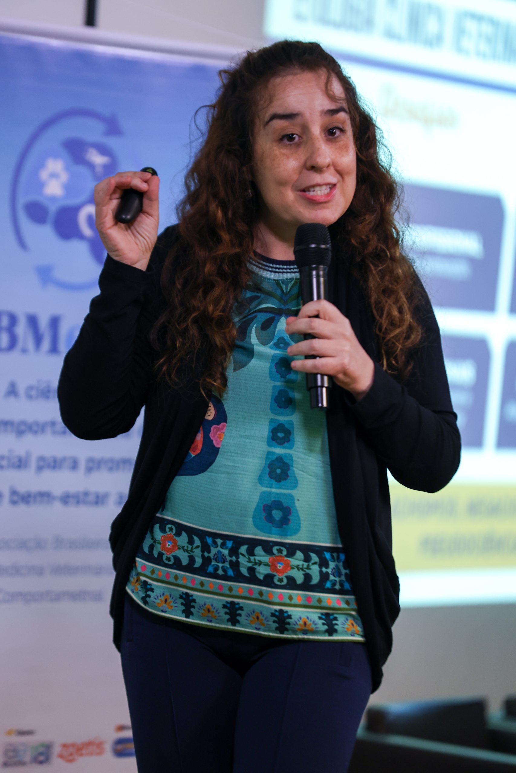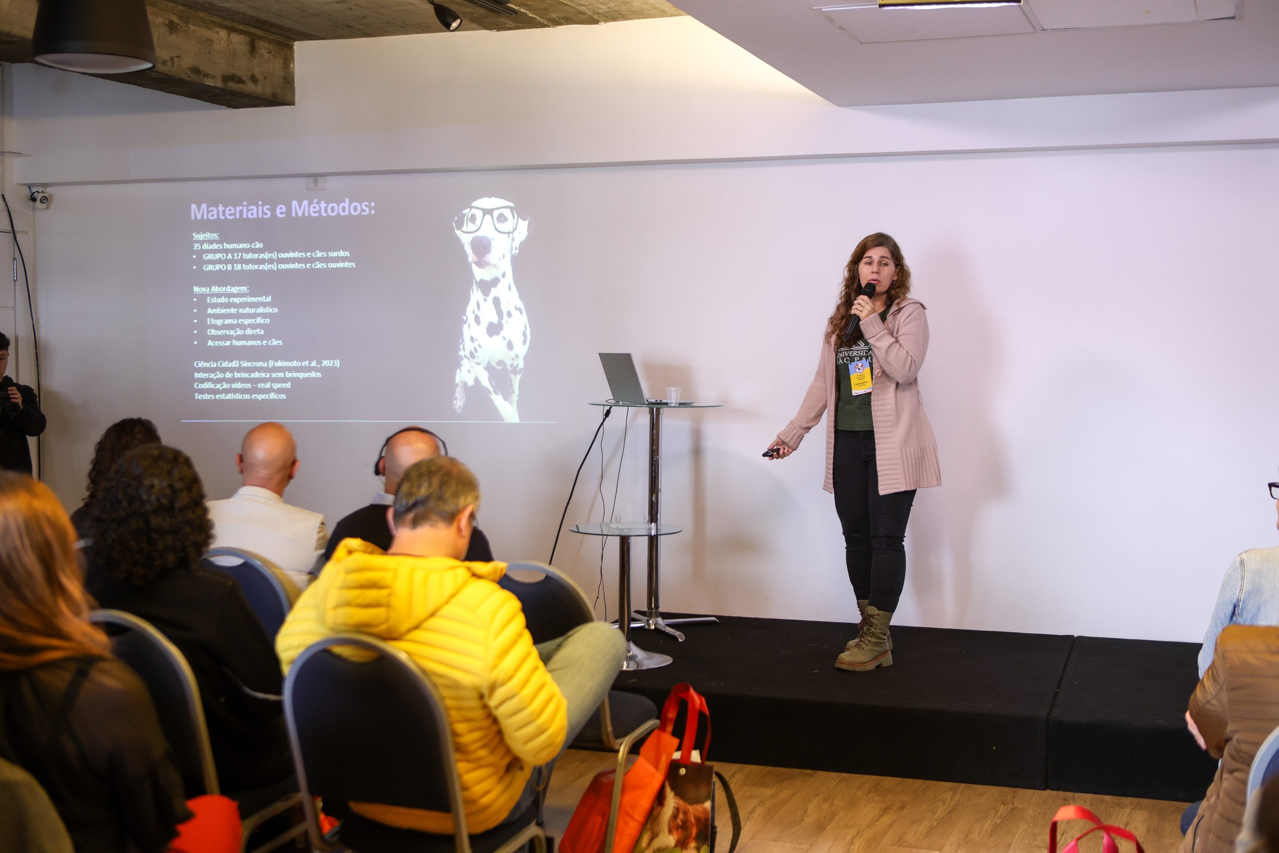 A dra. Daniela Ramos conduziu sessão sobre etologia clínica baseada em ciência, reforçando a necessidade de avaliação crítica das práticas diagnósticas e de intervenção comportamental com suporte em literatura e dados científicos.