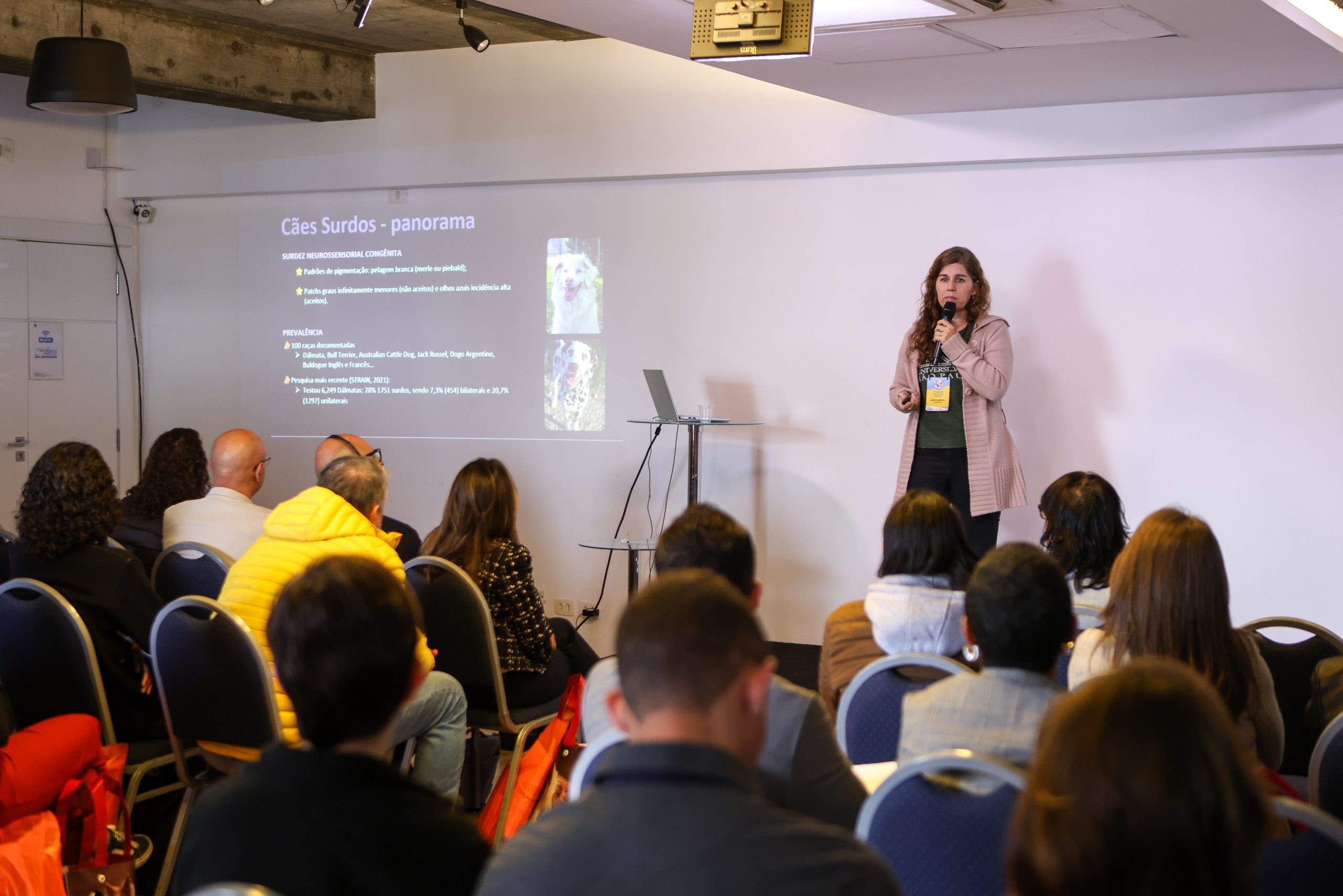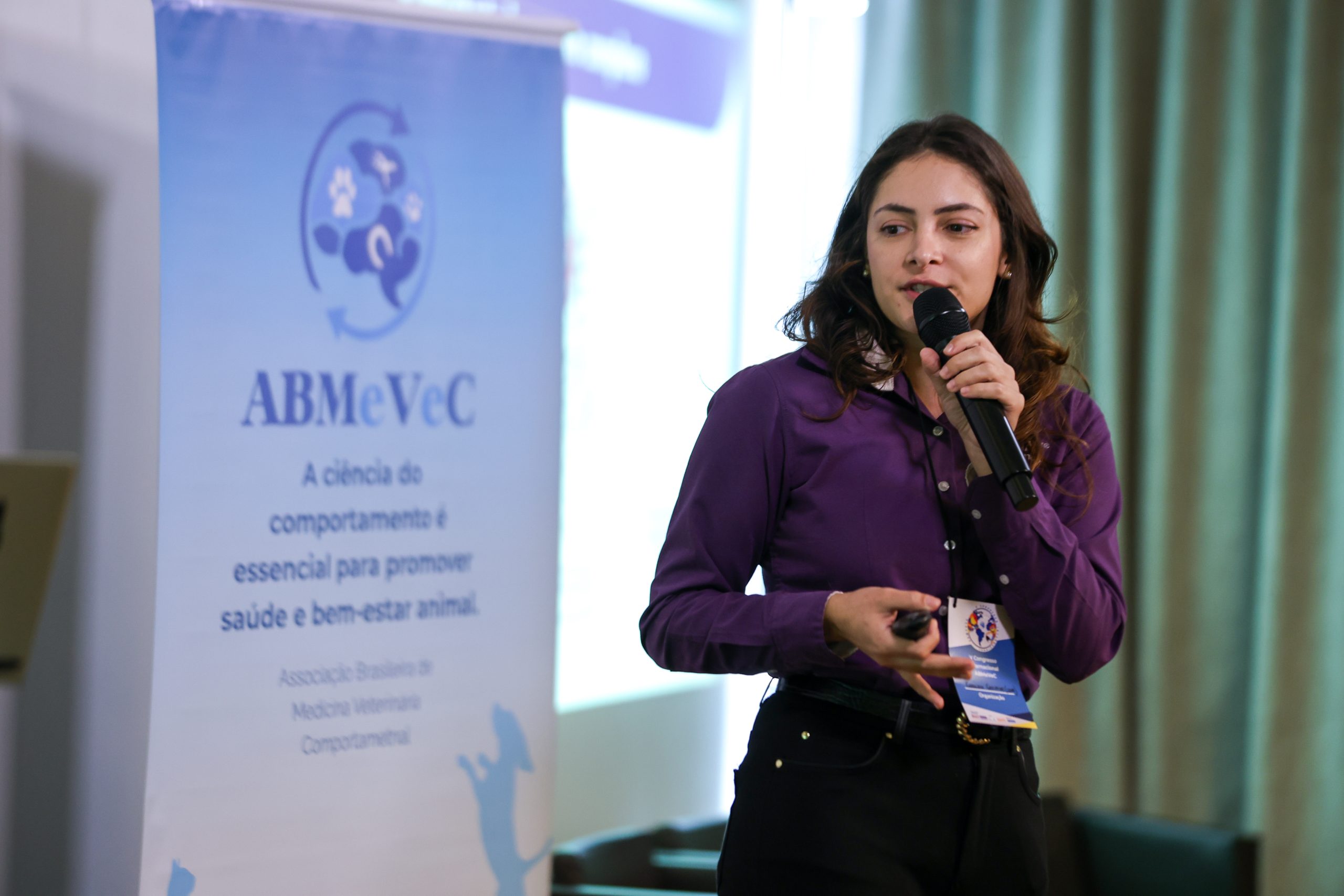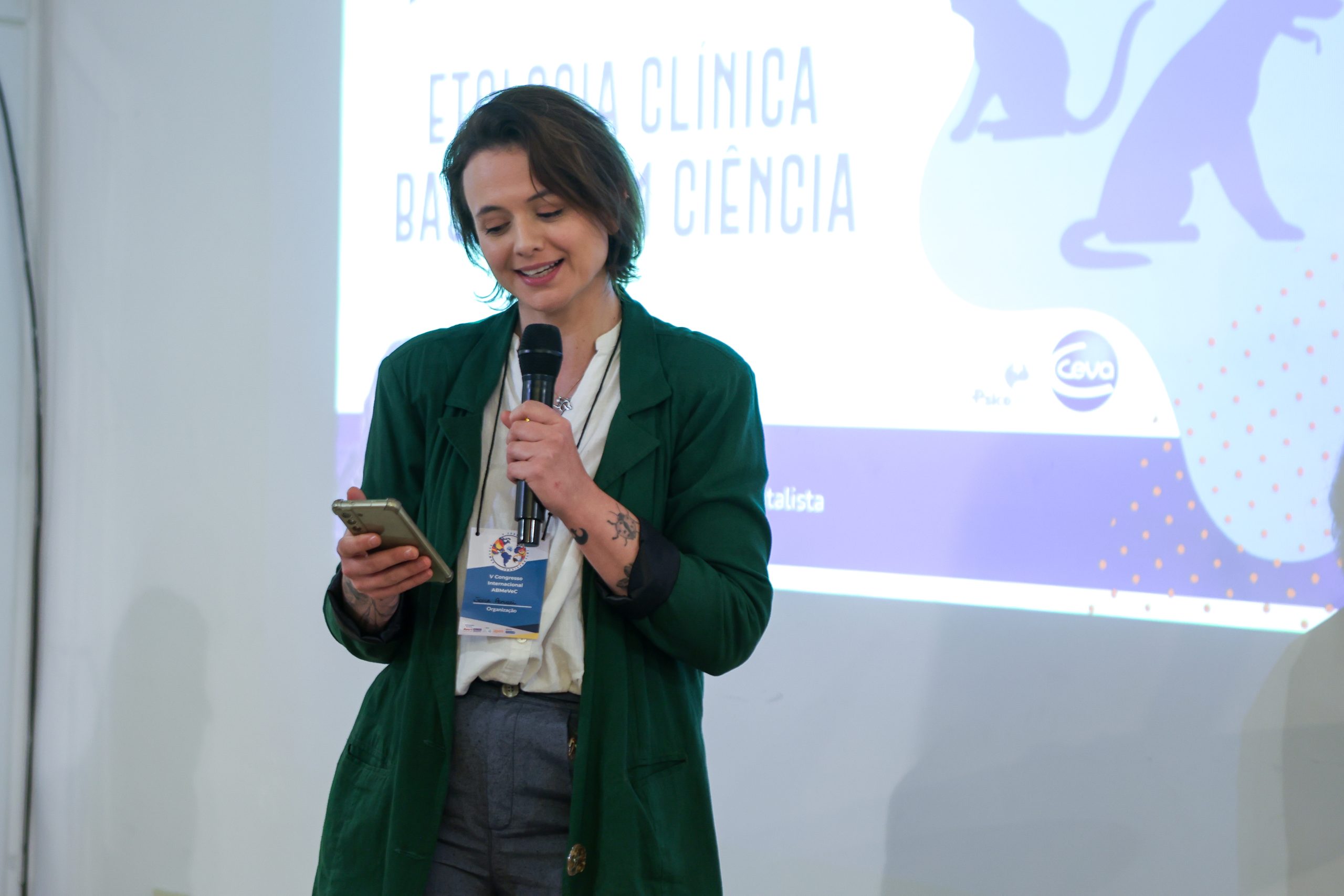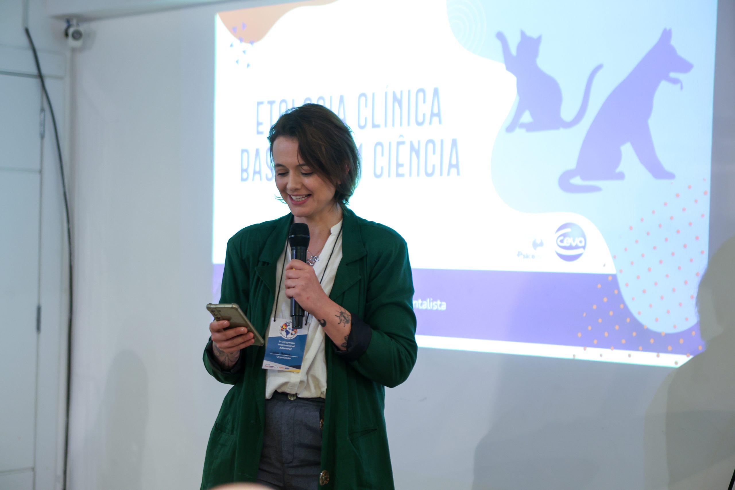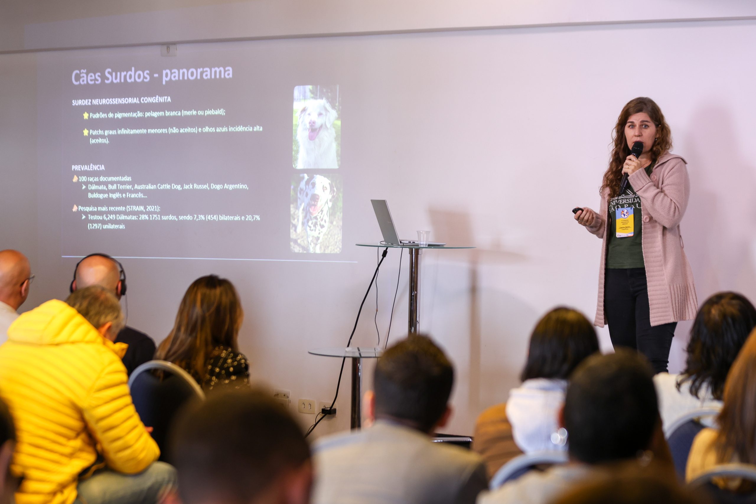 A dra. Daniela Ramos conduziu sessão sobre etologia clínica baseada em ciência, reforçando a necessidade de avaliação crítica das práticas diagnósticas e de intervenção comportamental com suporte em literatura e dados científicos.