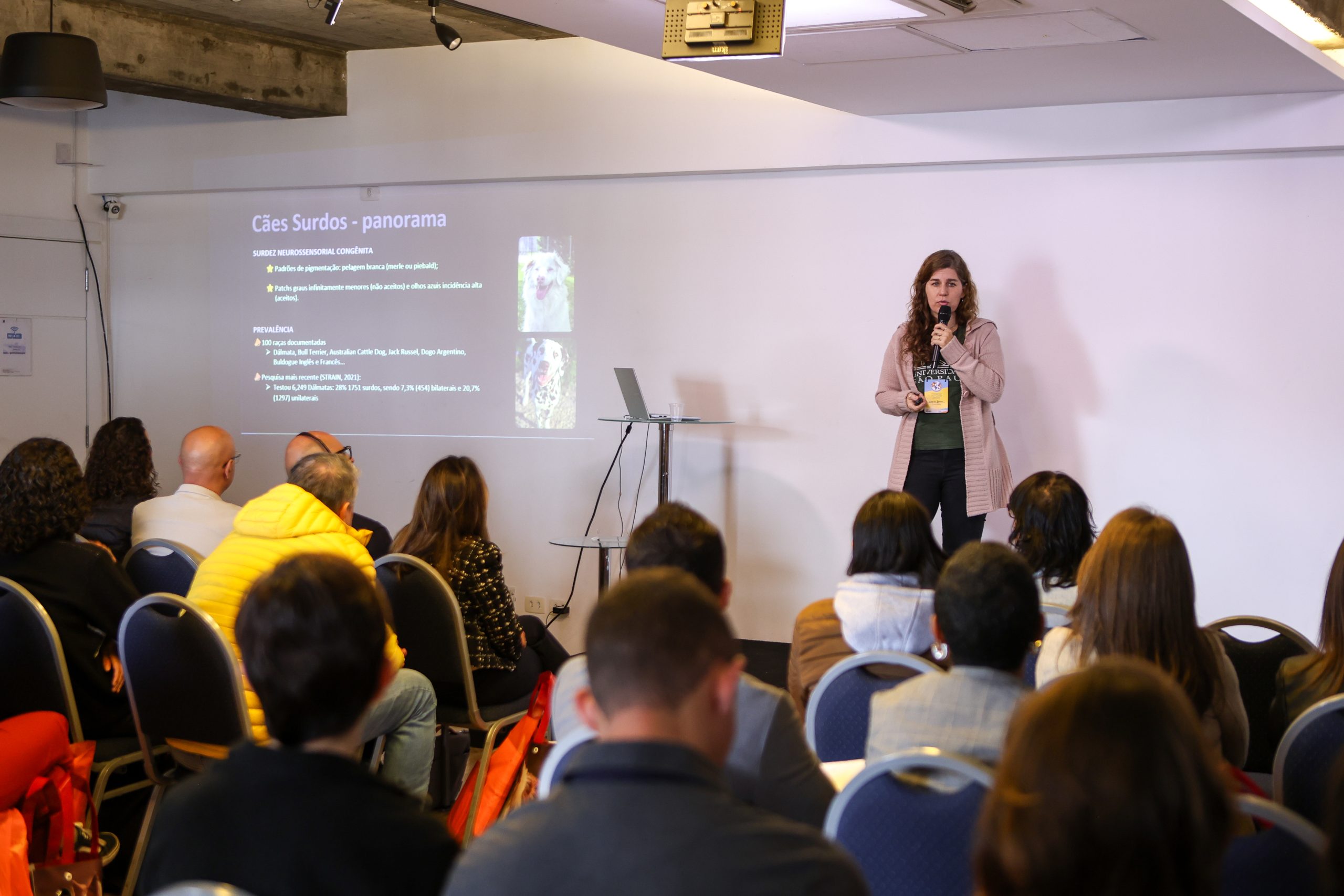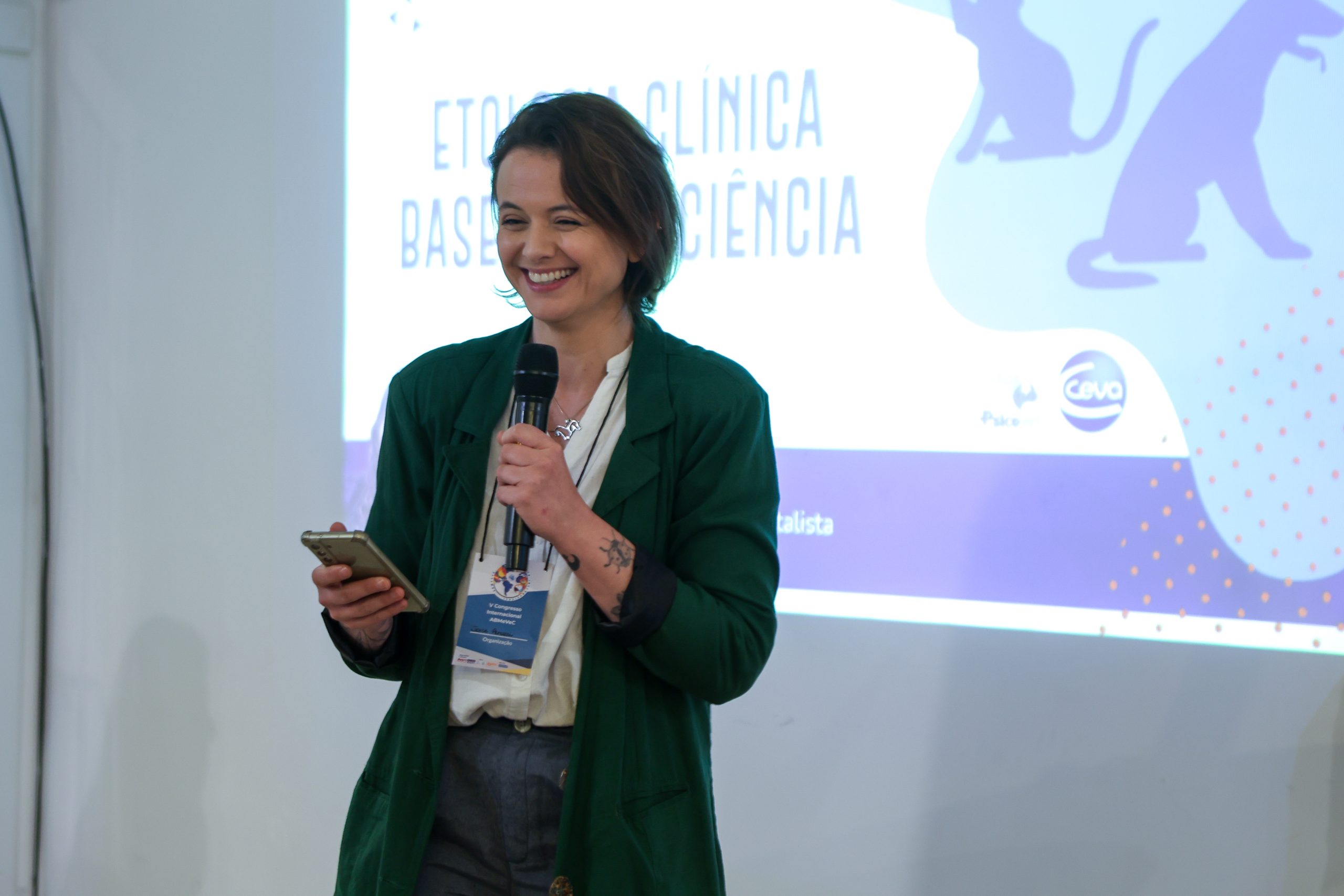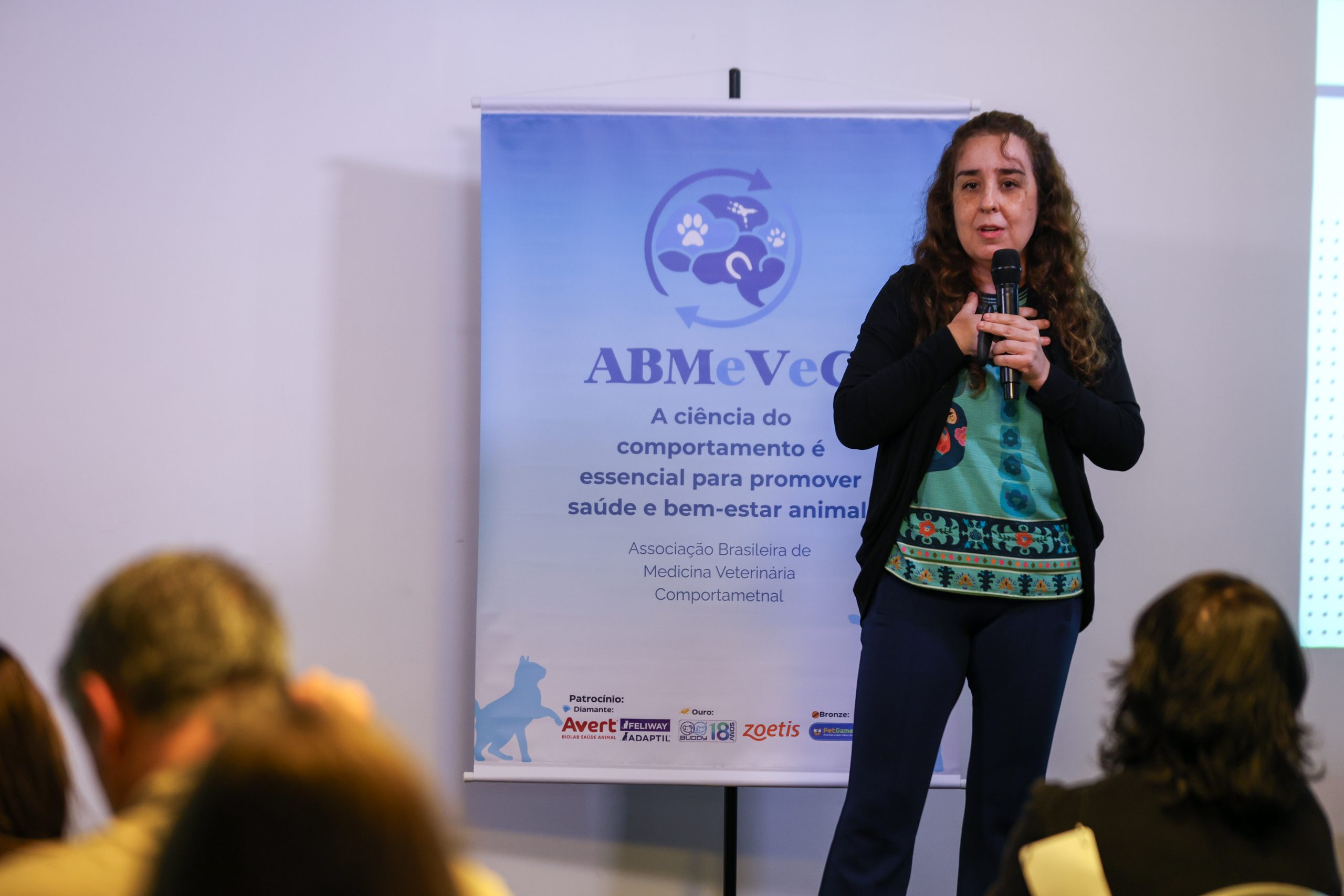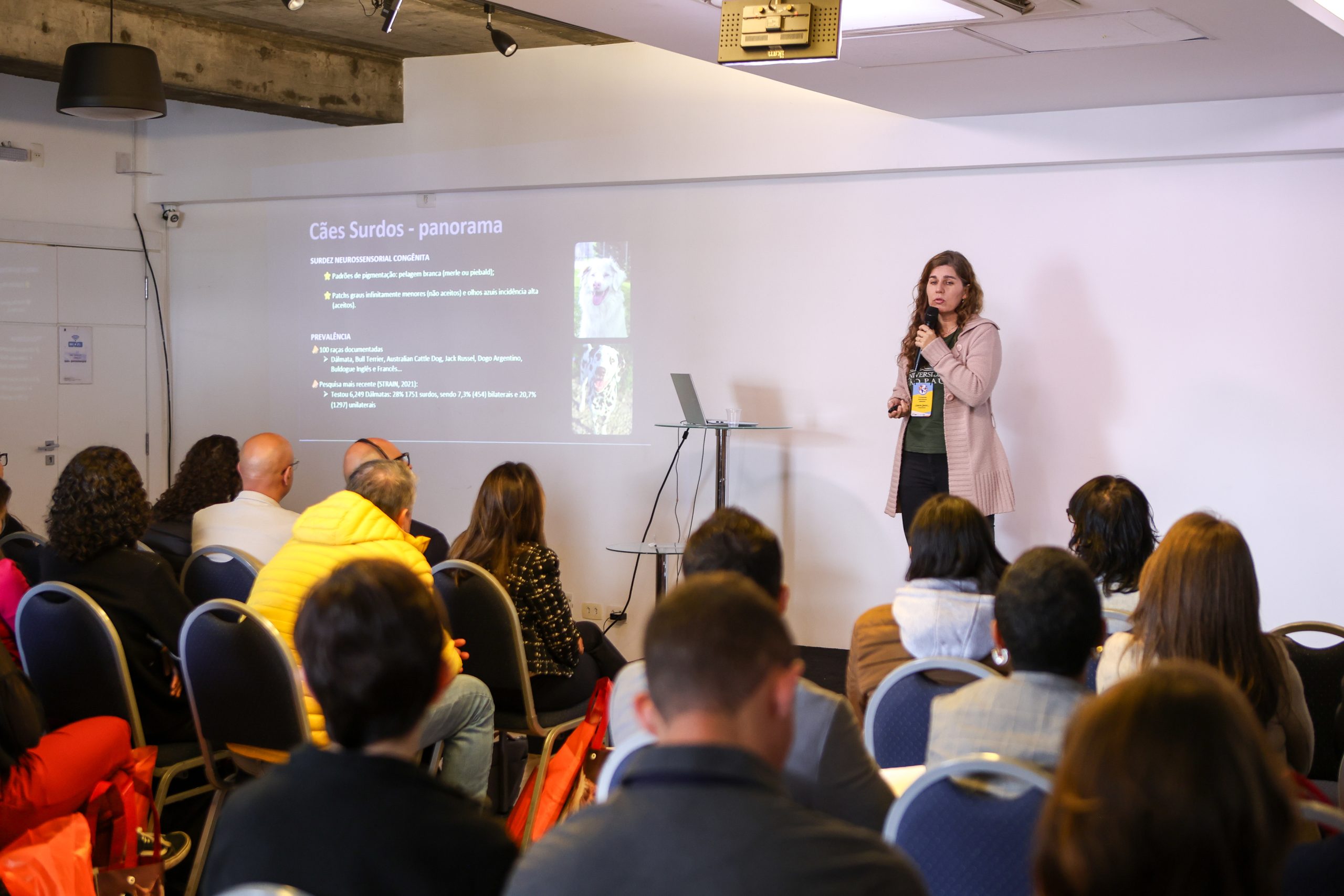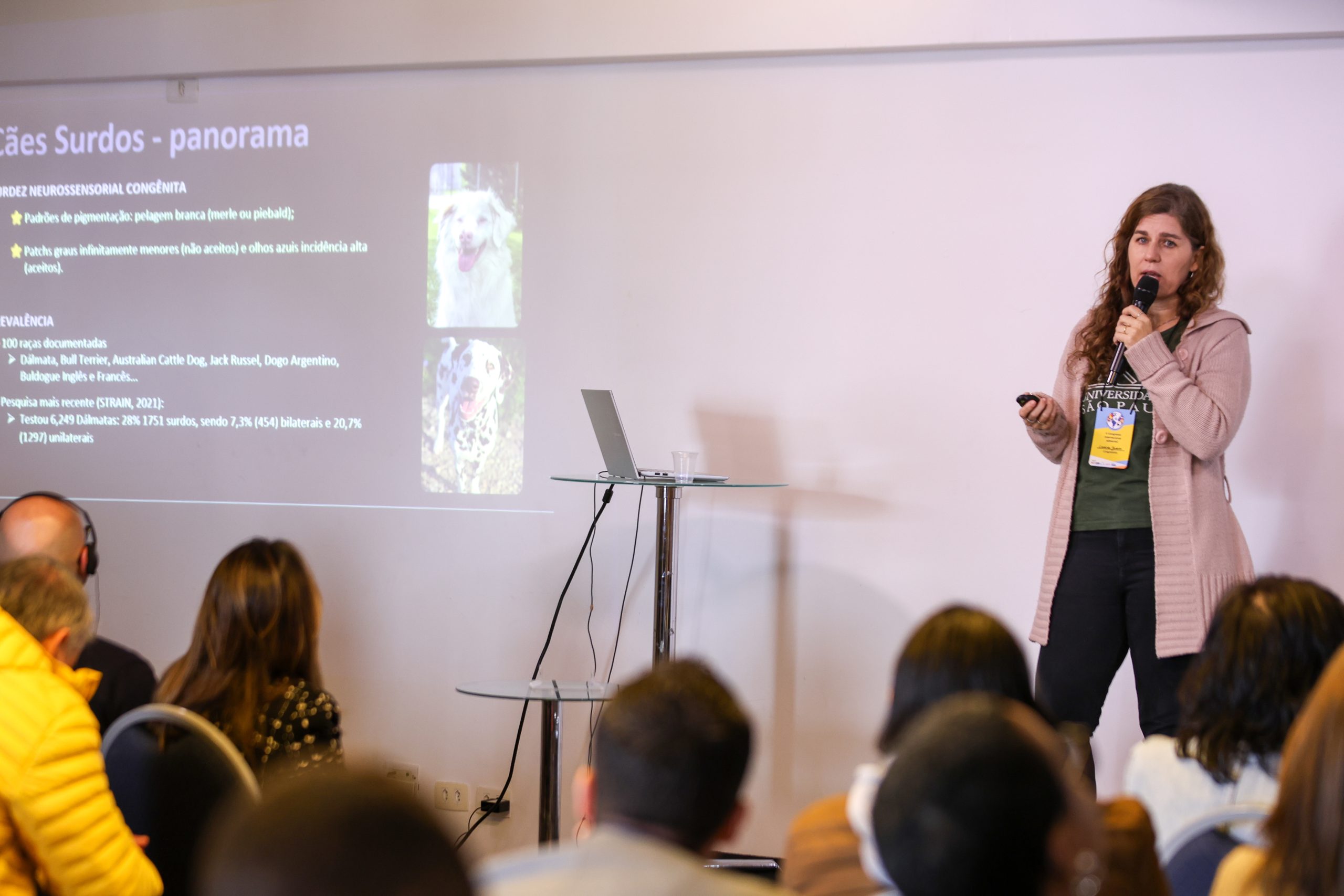A dra. Daniela Ramos conduziu sessão sobre etologia clínica baseada em ciência, reforçando a necessidade de avaliação crítica das práticas diagnósticas e de intervenção comportamental com suporte em literatura e dados científicos.