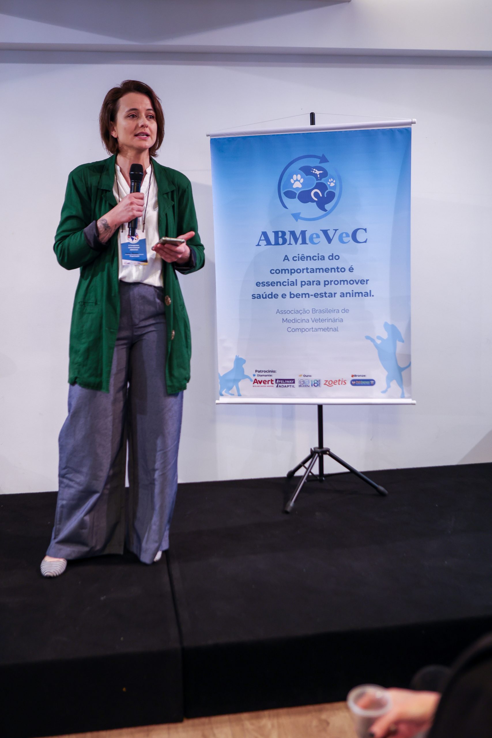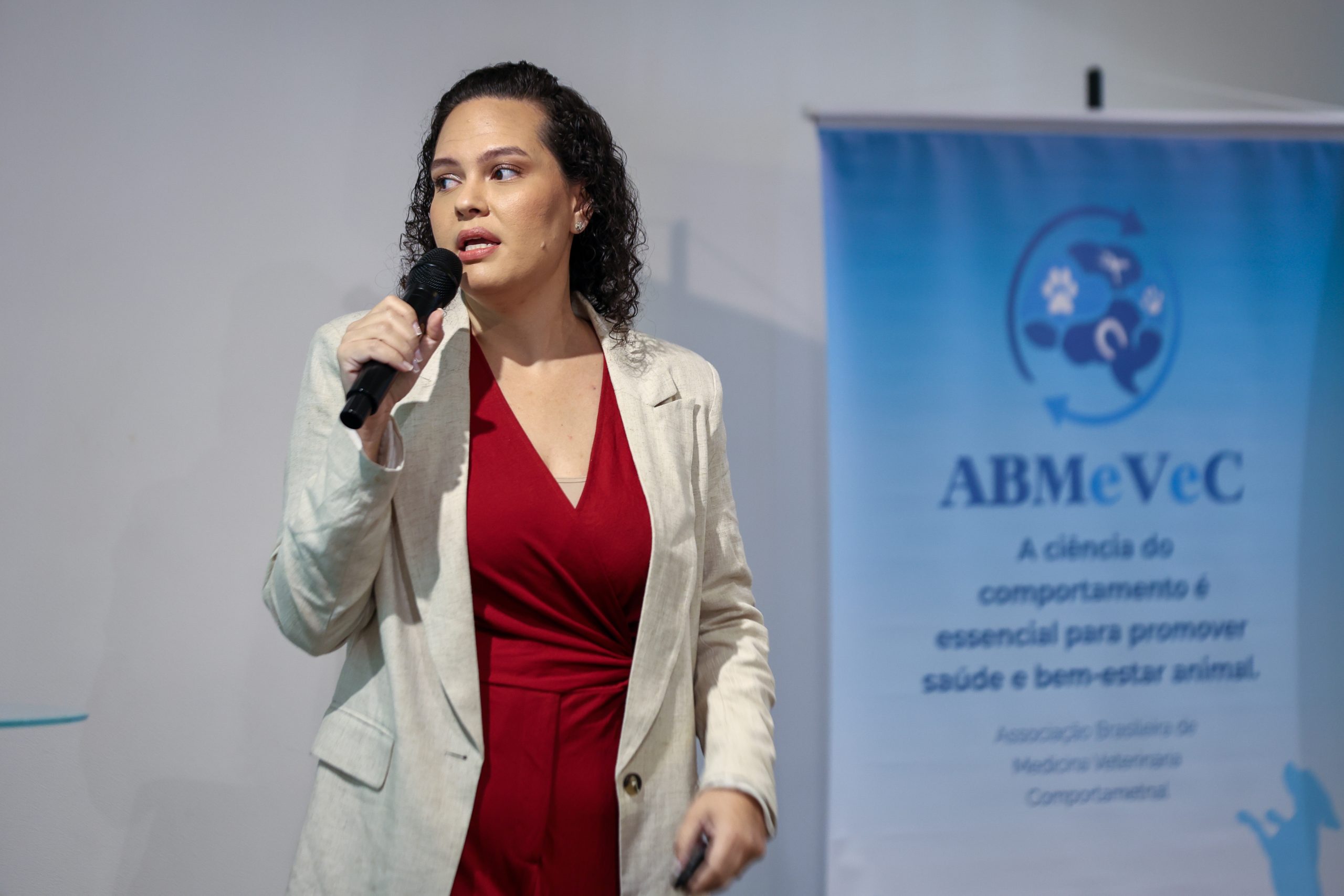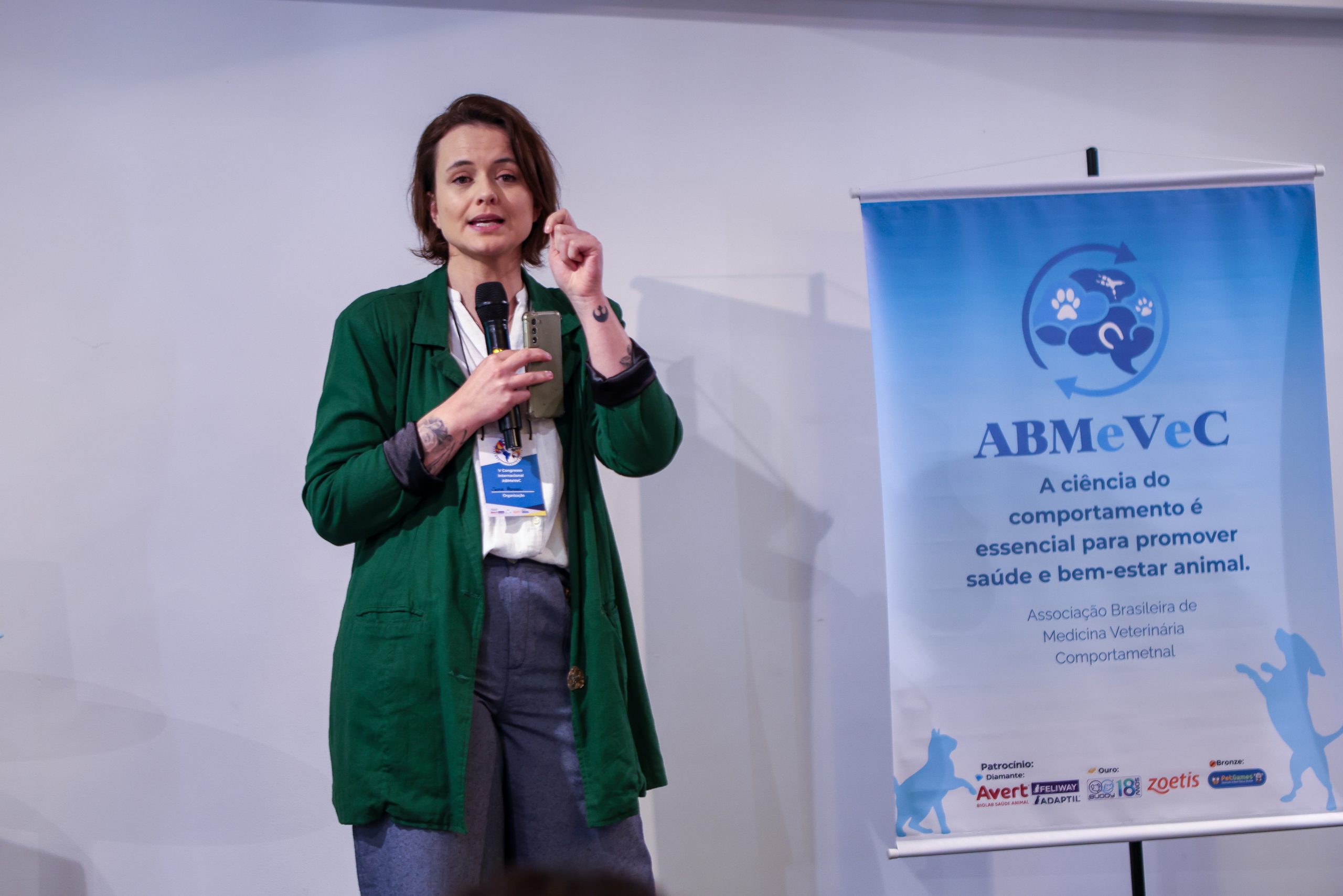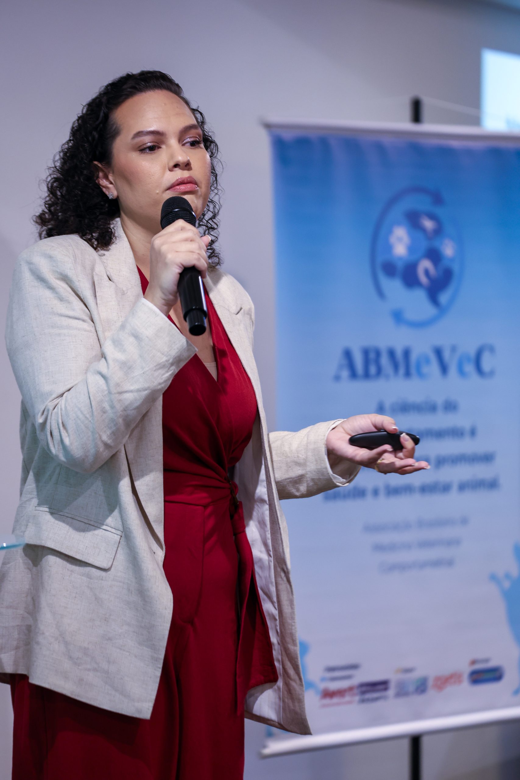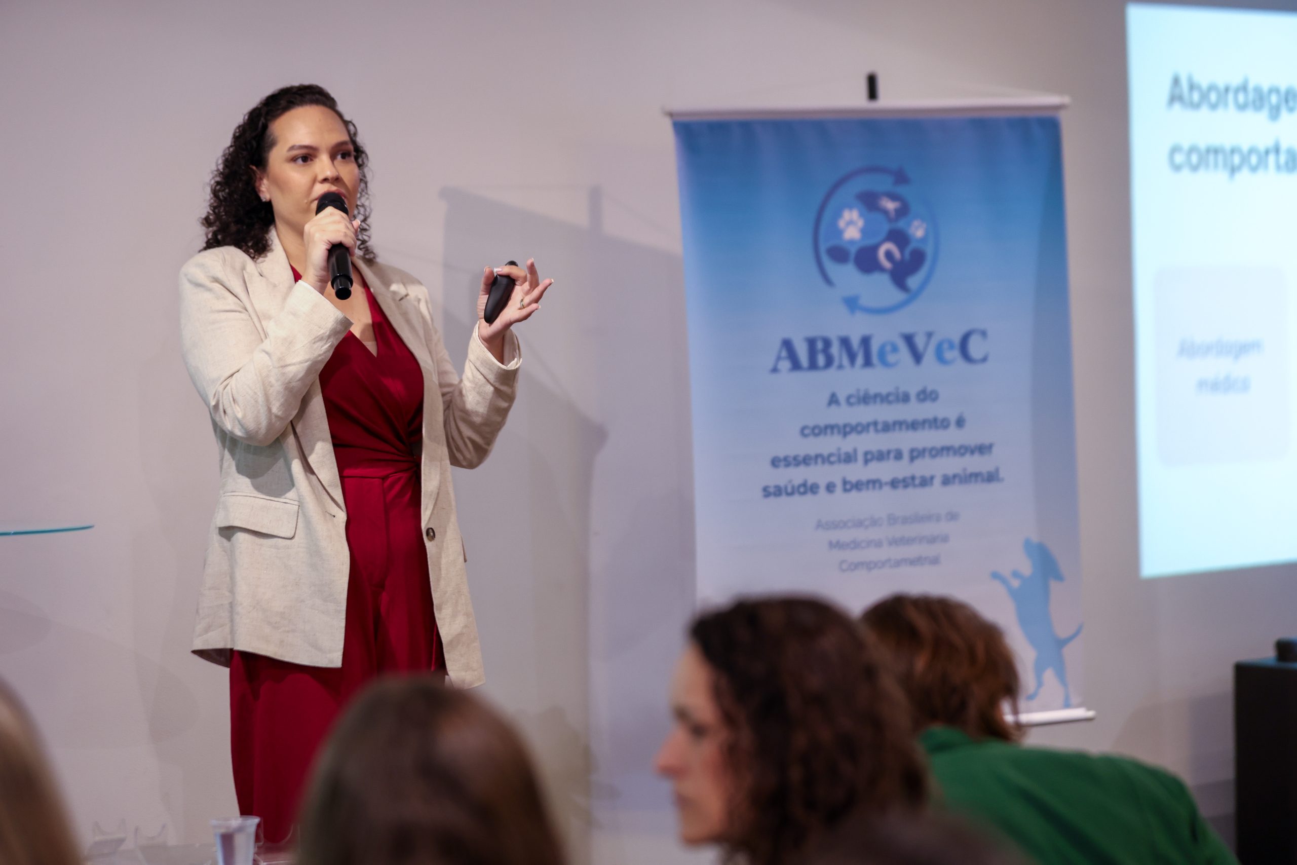 A dra. Daniela Ramos conduziu sessão sobre etologia clínica baseada em ciência, reforçando a necessidade de avaliação crítica das práticas diagnósticas e de intervenção comportamental com suporte em literatura e dados científicos.