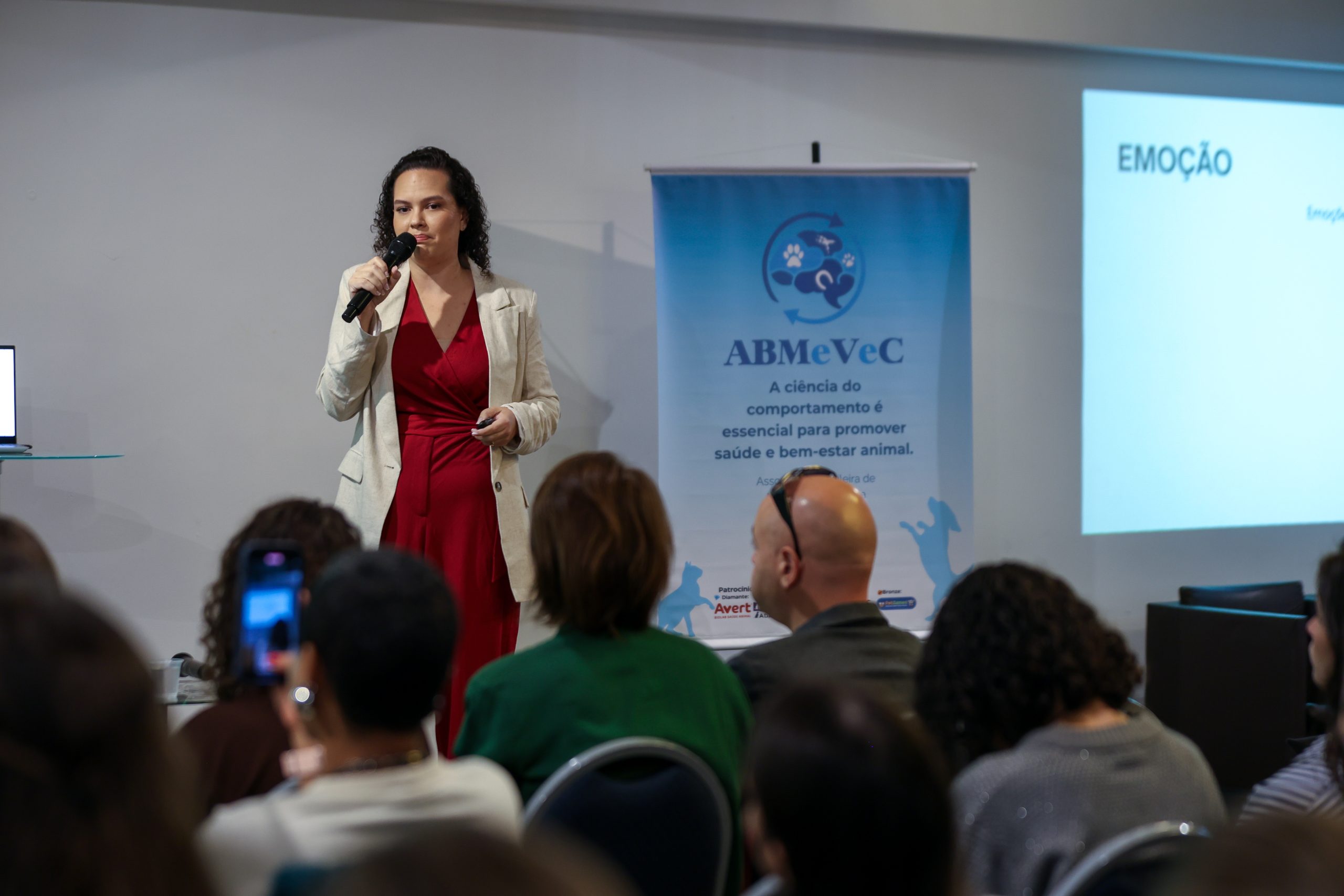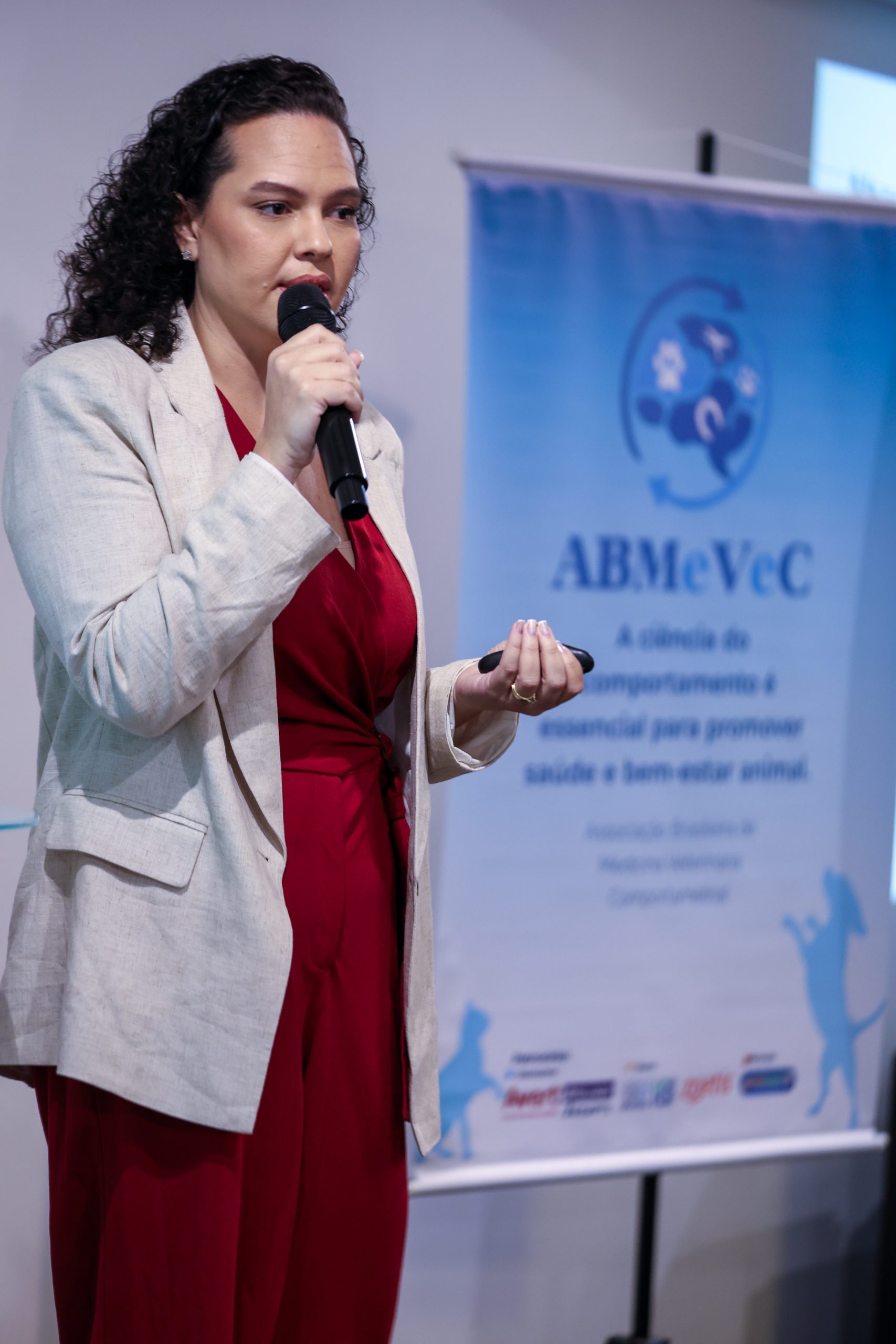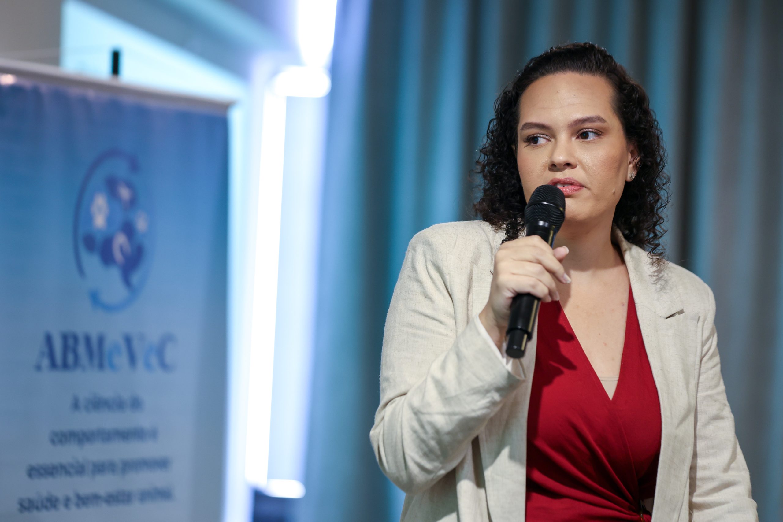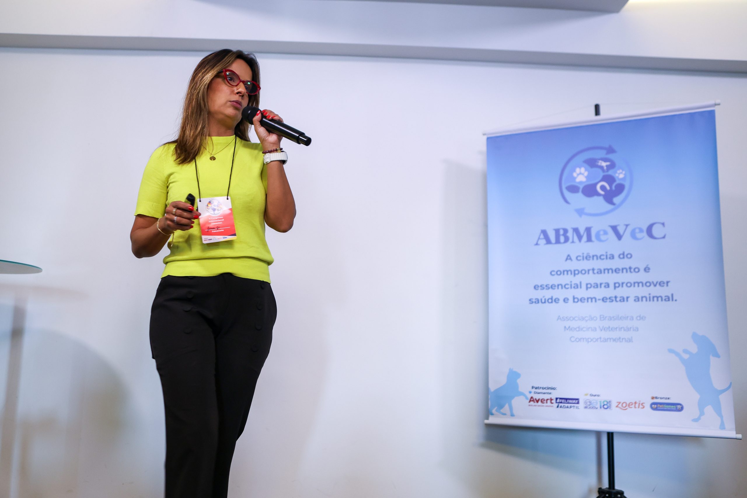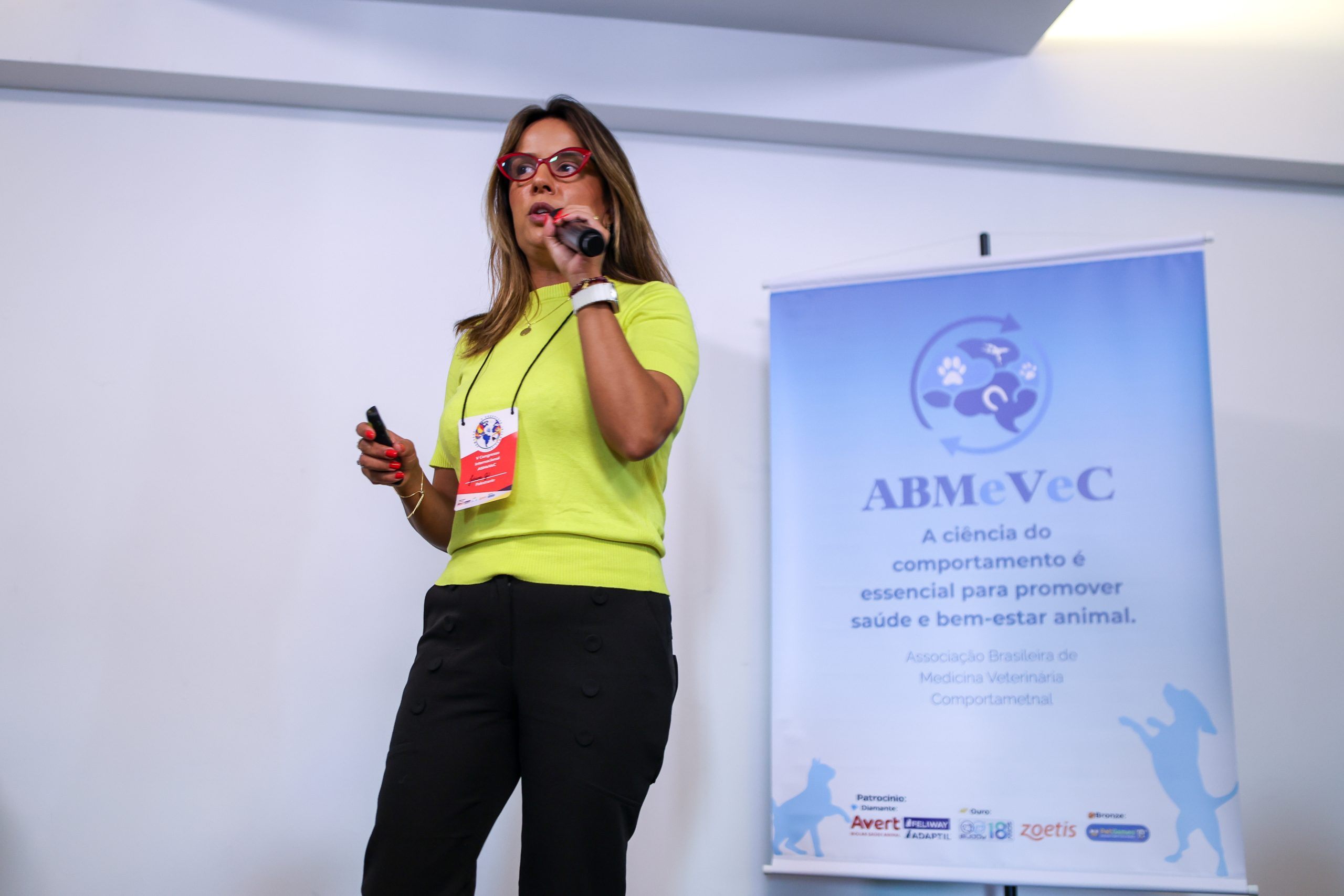 A dra. Daniela Ramos conduziu sessão sobre etologia clínica baseada em ciência, reforçando a necessidade de avaliação crítica das práticas diagnósticas e de intervenção comportamental com suporte em literatura e dados científicos.