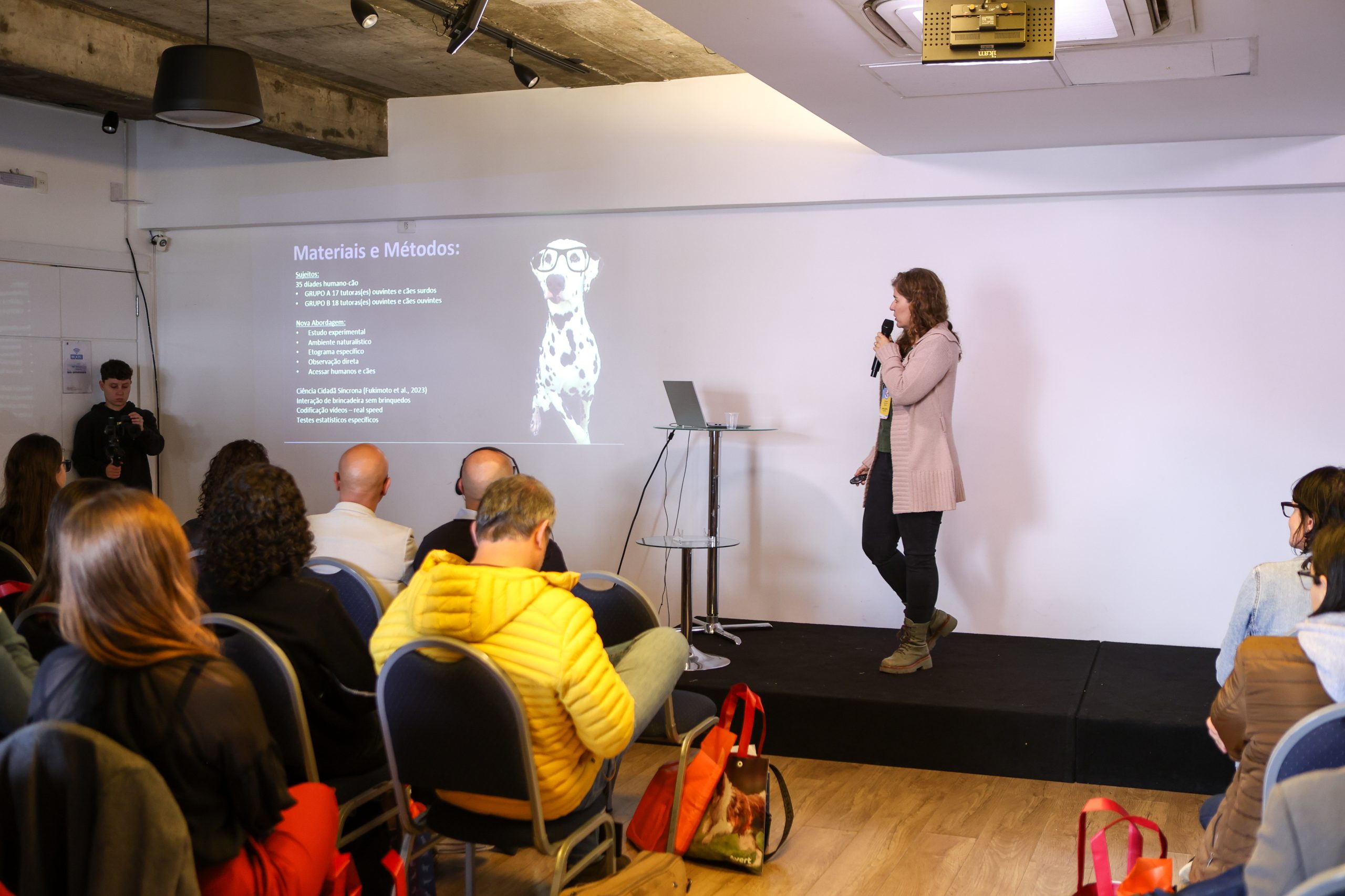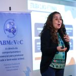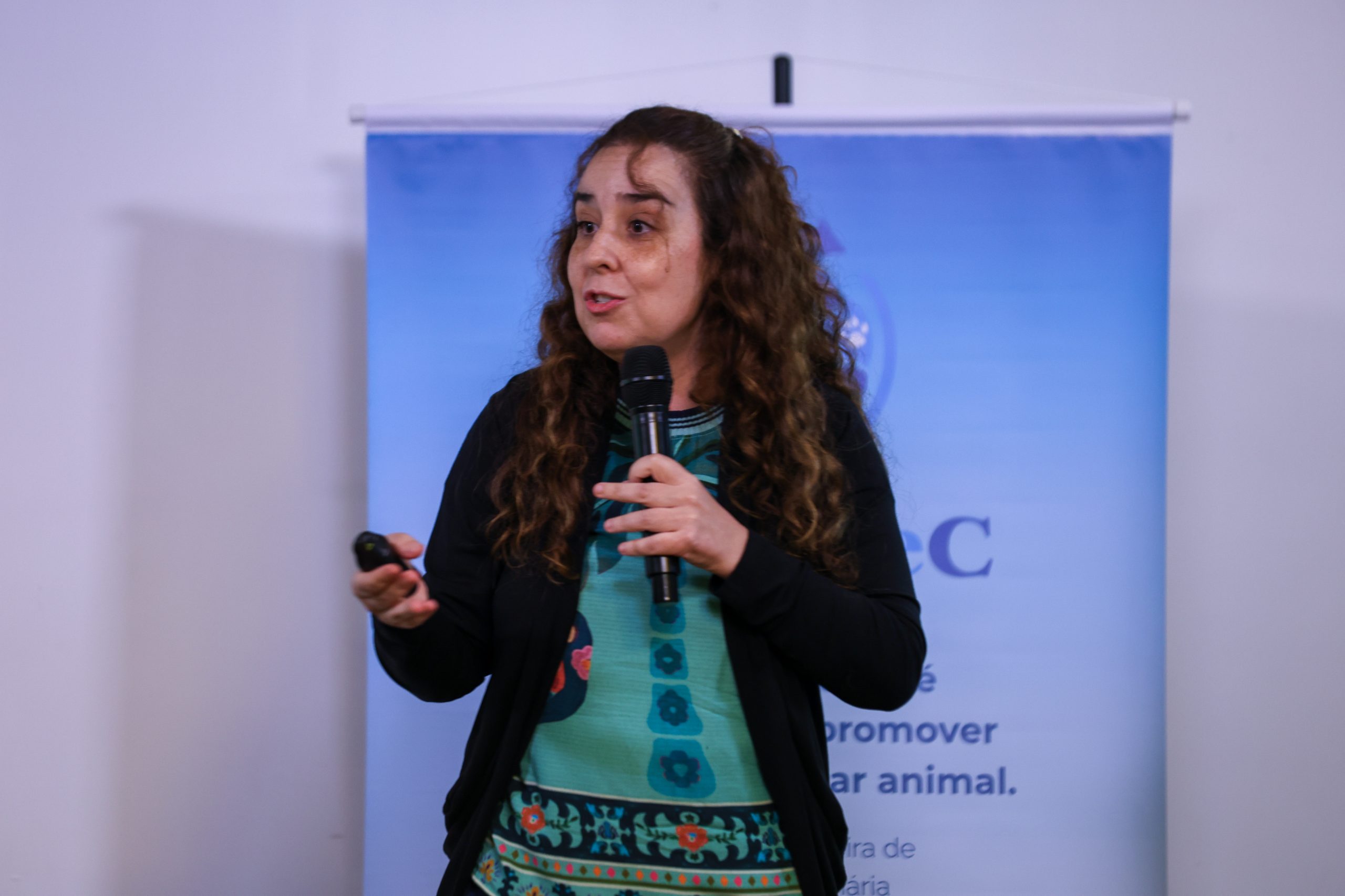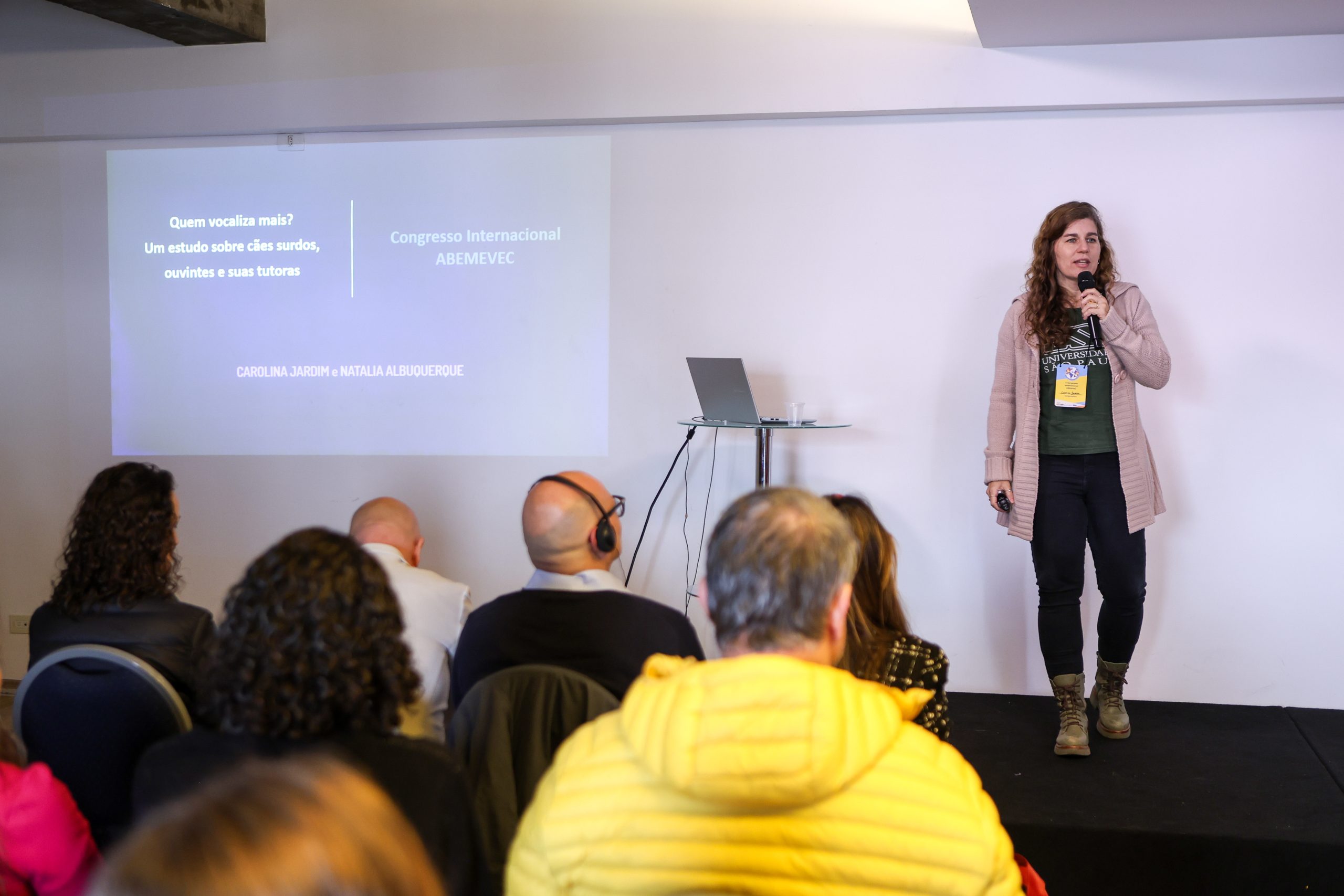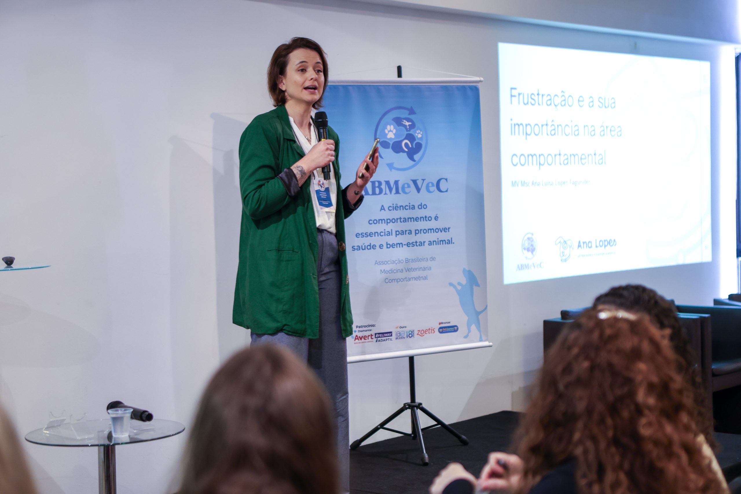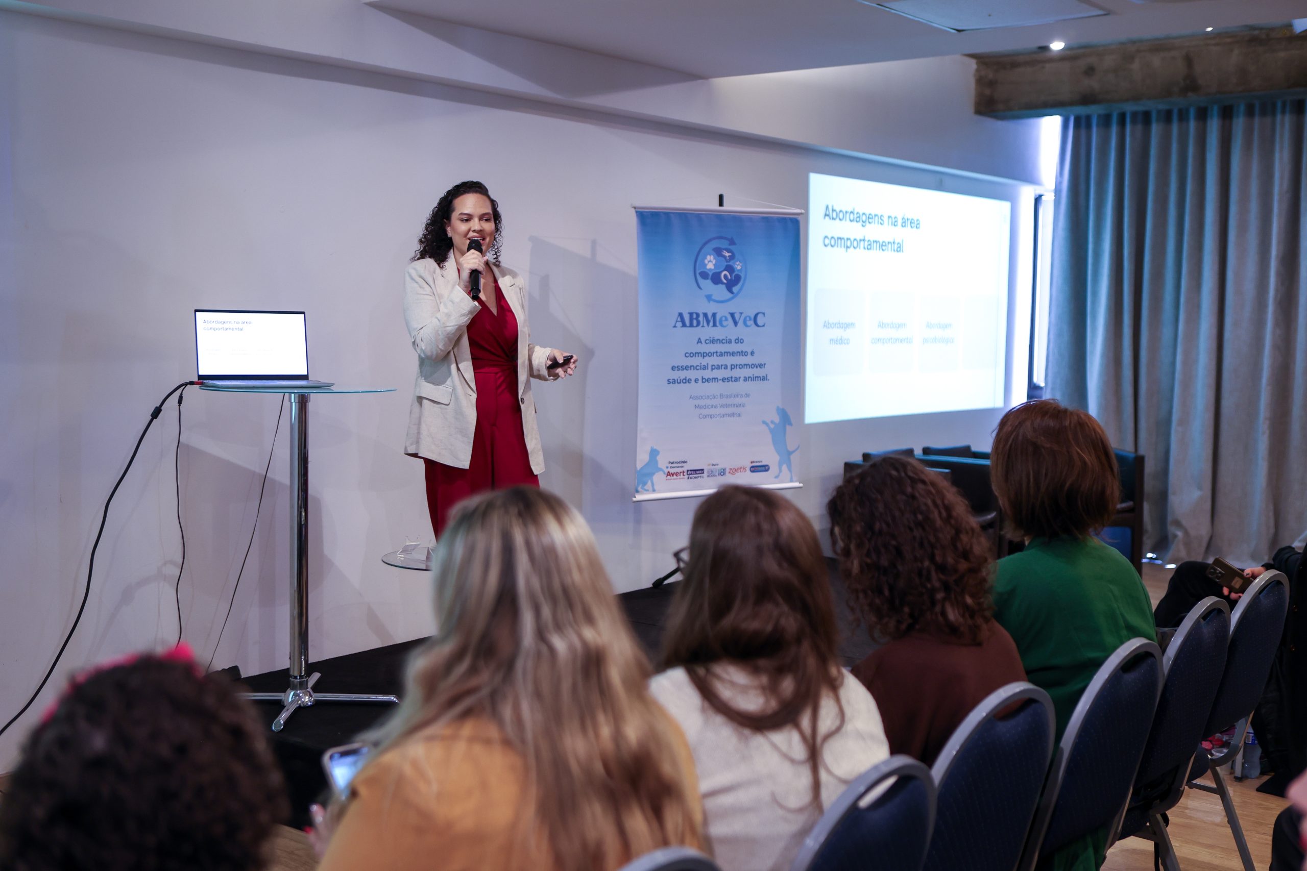A dra. Daniela Ramos conduziu sessão sobre etologia clínica baseada em ciência, reforçando a necessidade de avaliação crítica das práticas diagnósticas e de intervenção comportamental com suporte em literatura e dados científicos.
