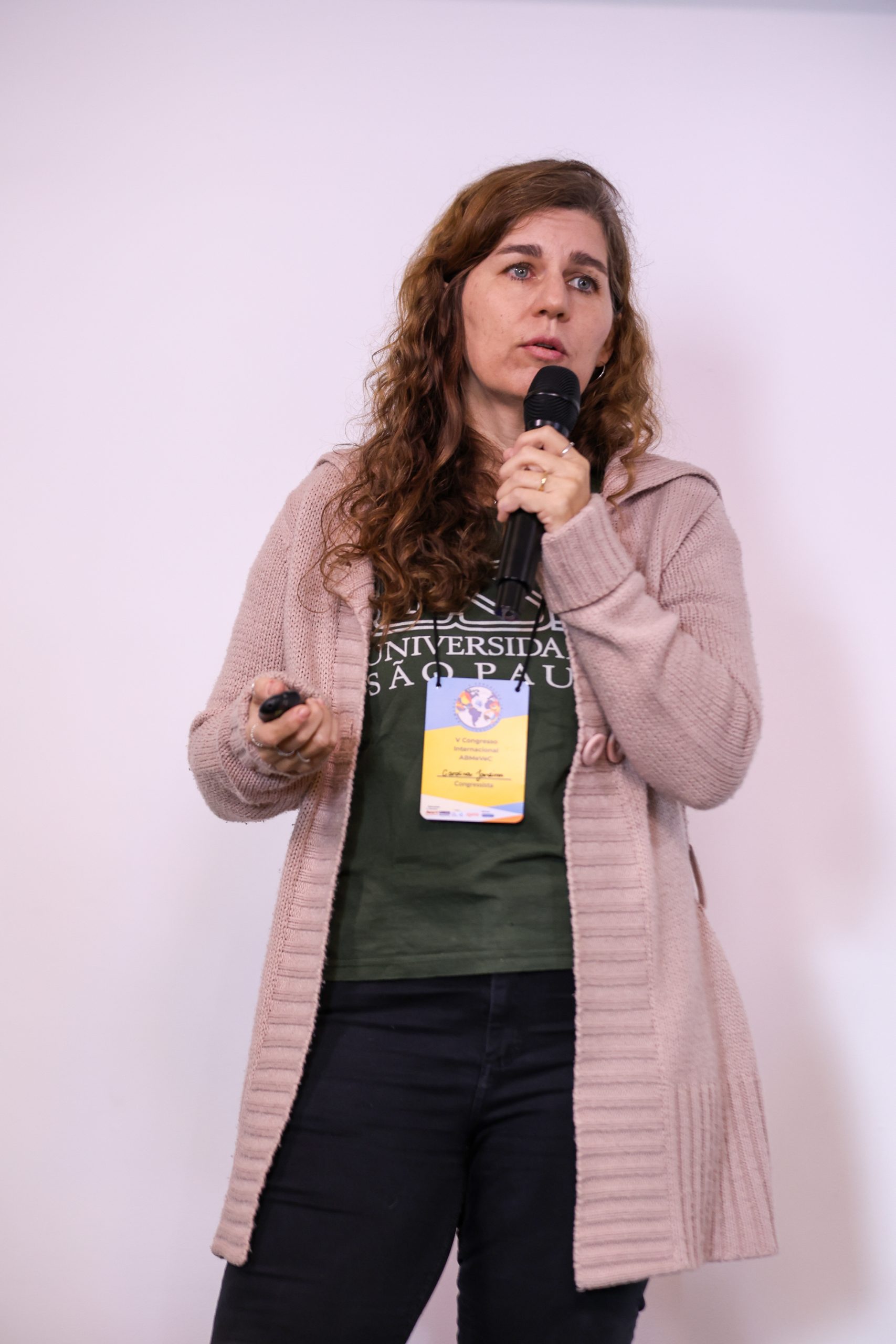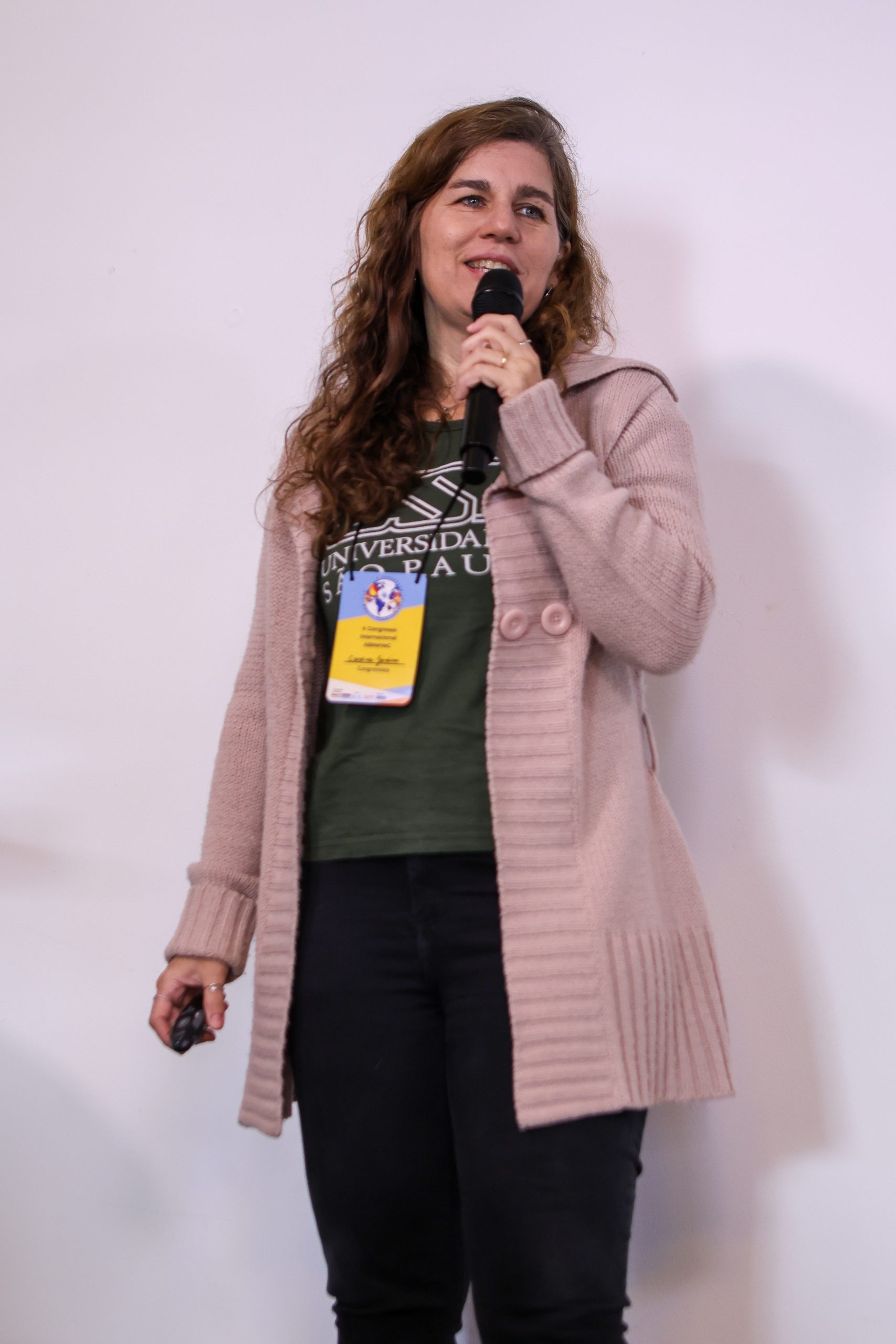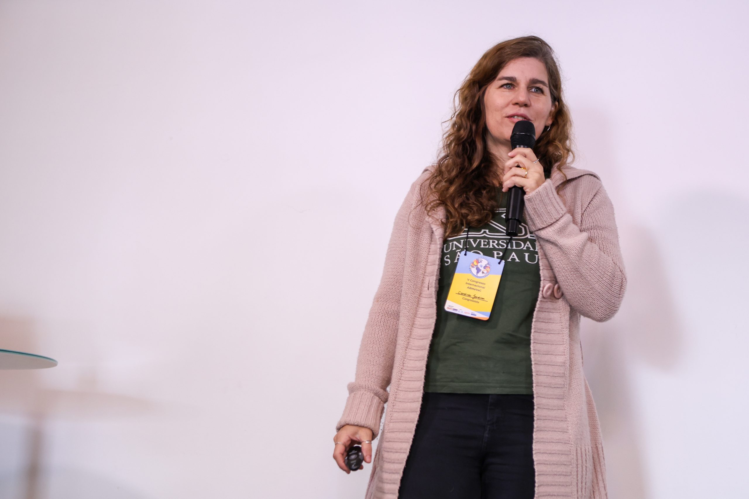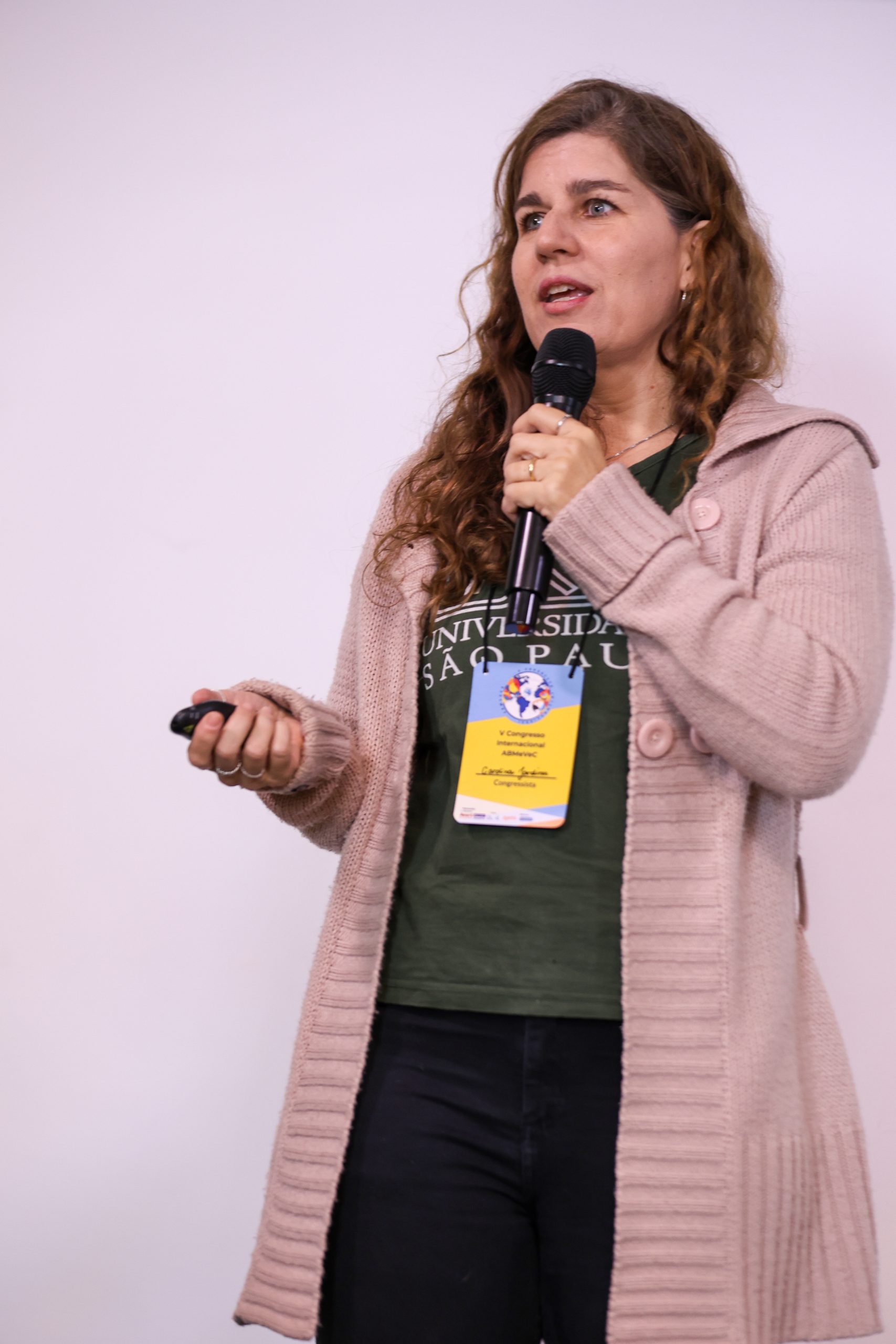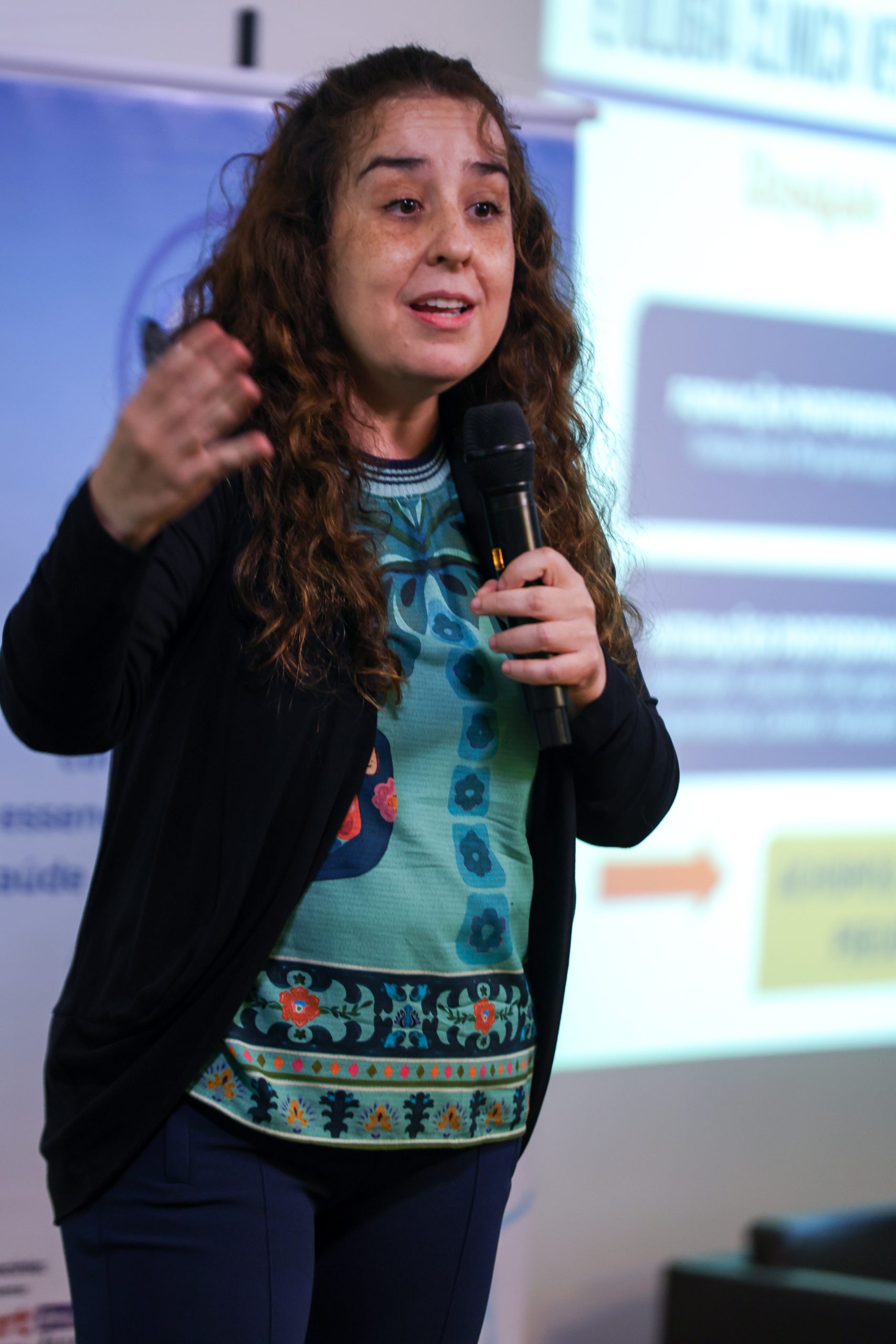 A dra. Daniela Ramos conduziu sessão sobre etologia clínica baseada em ciência, reforçando a necessidade de avaliação crítica das práticas diagnósticas e de intervenção comportamental com suporte em literatura e dados científicos.