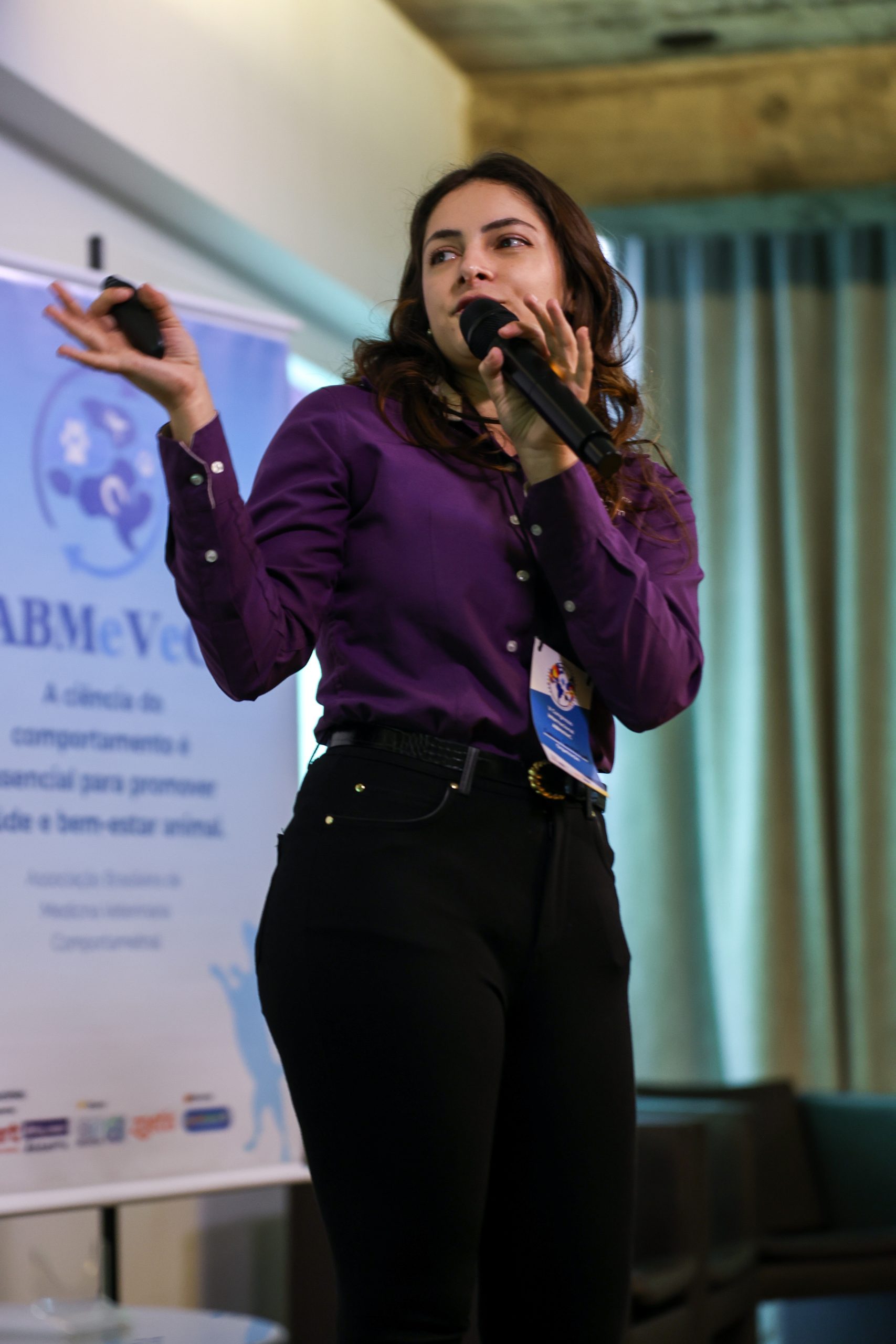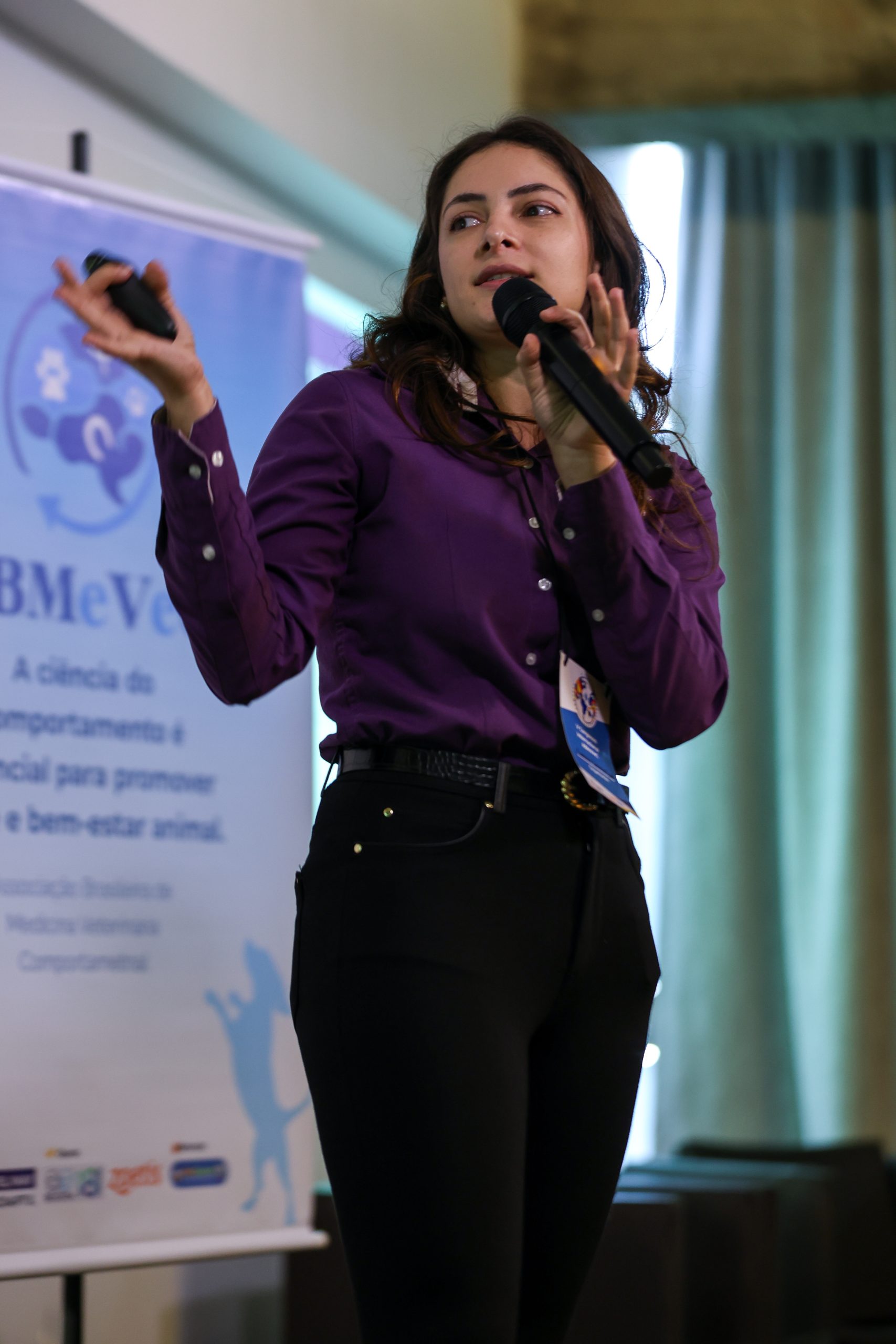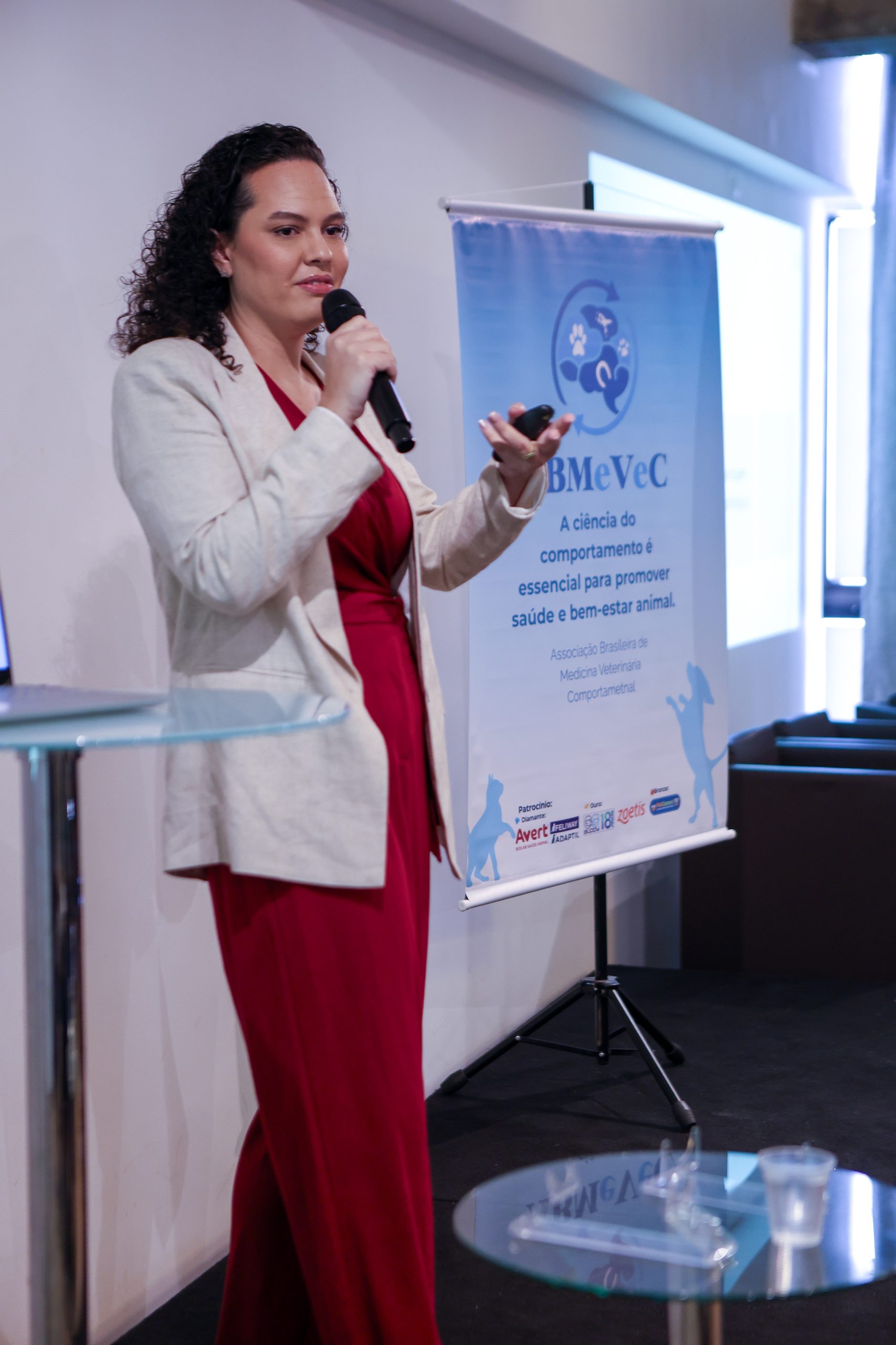 A dra. Juliana Gil, destacando aplicações emergentes, apresentou sobre o uso criterioso de psicoativos na prática clínica para medo e ansiedade em cães, integrando neurociência comportamental com abordagens terapêuticas inovadoras.