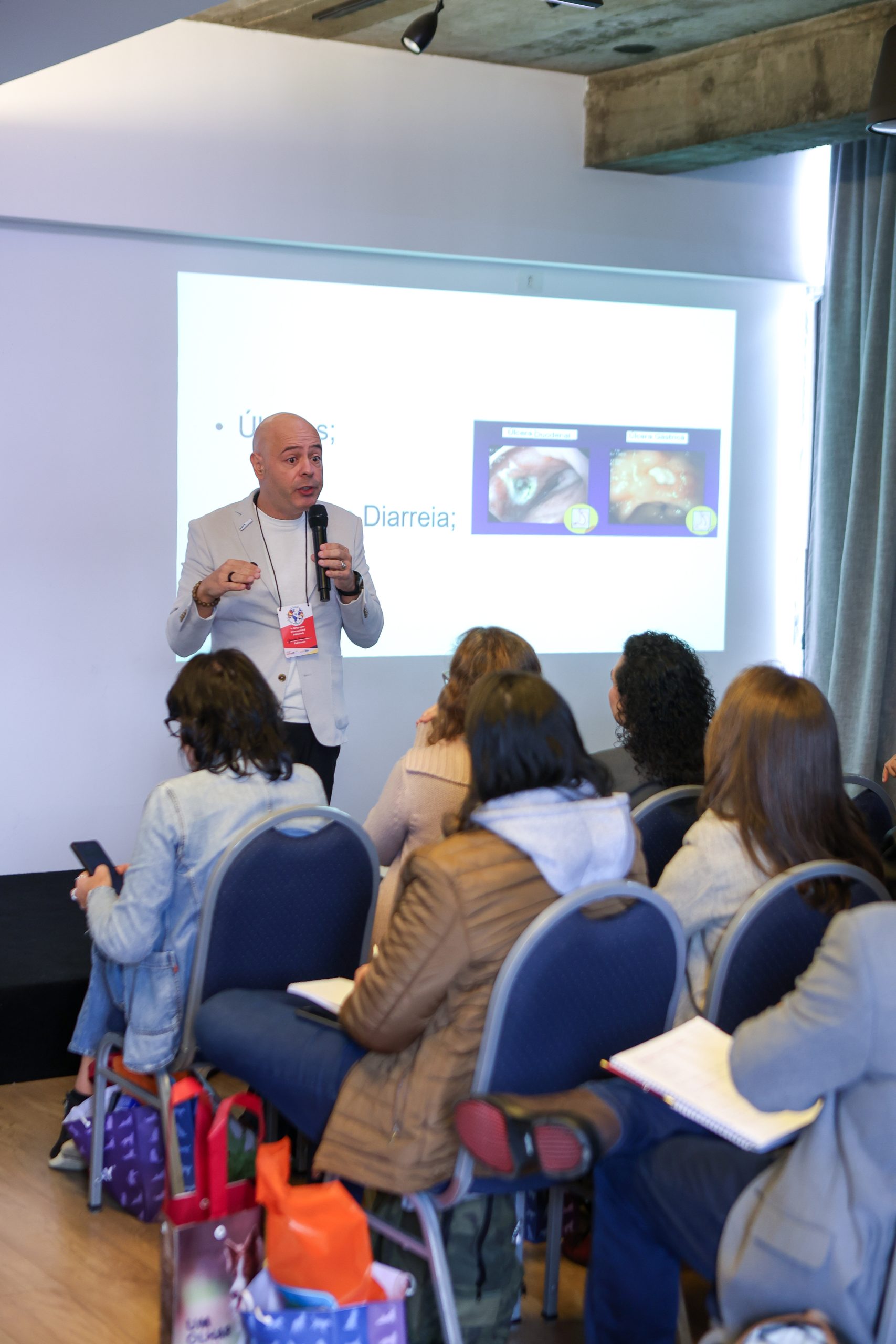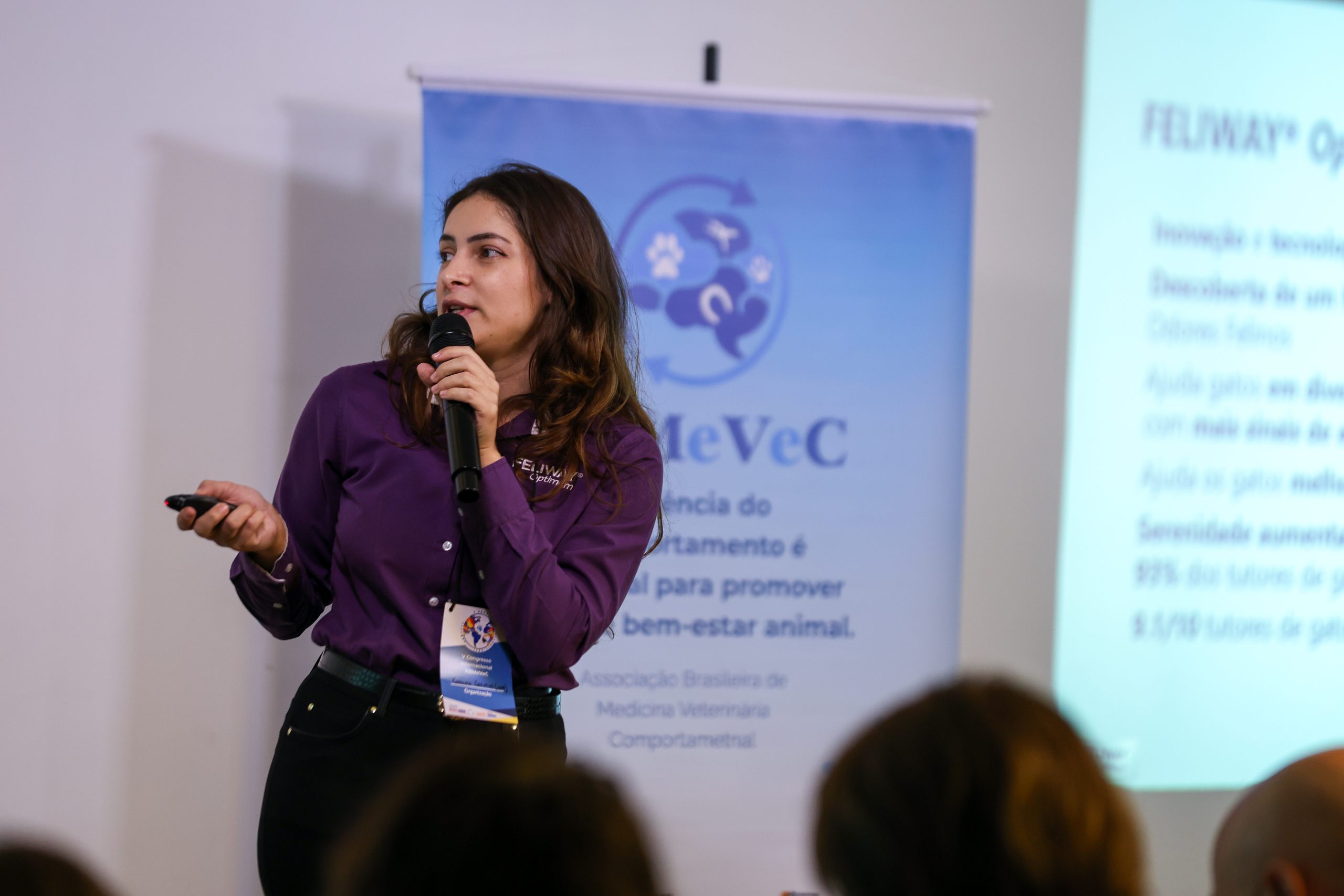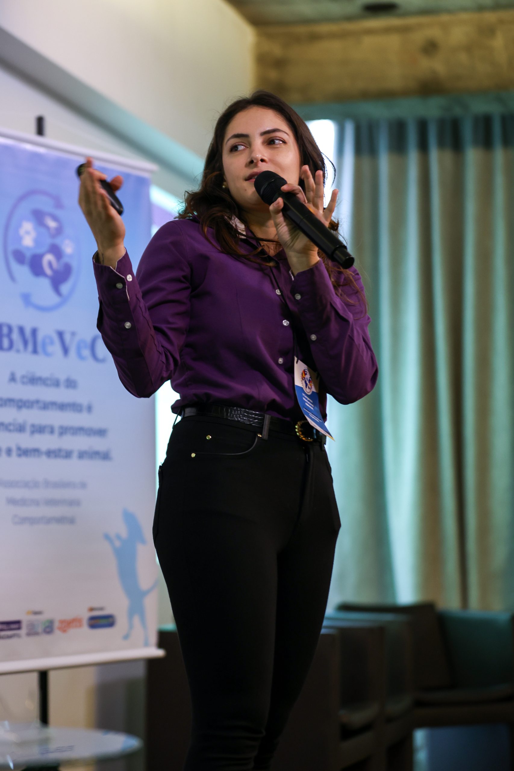 A dra. Juliana Gil, destacando aplicações emergentes, apresentou sobre o uso criterioso de psicoativos na prática clínica para medo e ansiedade em cães, integrando neurociência comportamental com abordagens terapêuticas inovadoras.